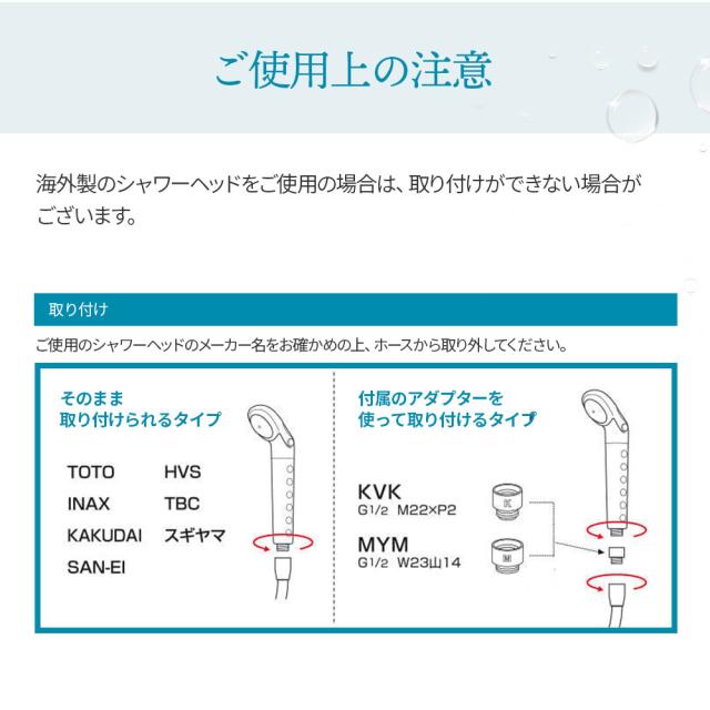 ※海外製のシャワーヘッドをご使用の場合は、取り付けができない場合がございます。