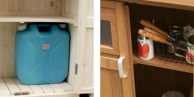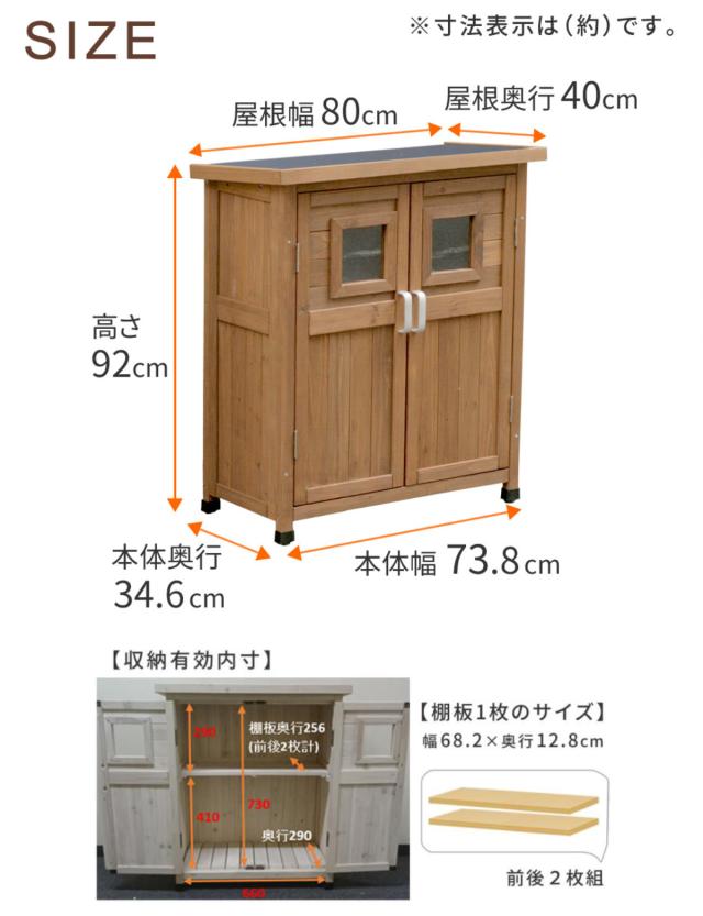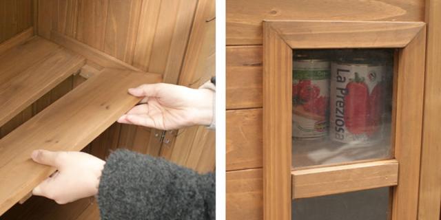 | 棚板は二枚分割式 手前の板を取り外すと、高さのあるものが収納できます。 | アクリル製の小窓付き 中の収納物が確認できる透明な小窓付きです。アクリル製なので、割れる心配がなく屋外でも安心してお使いいただけます。 |