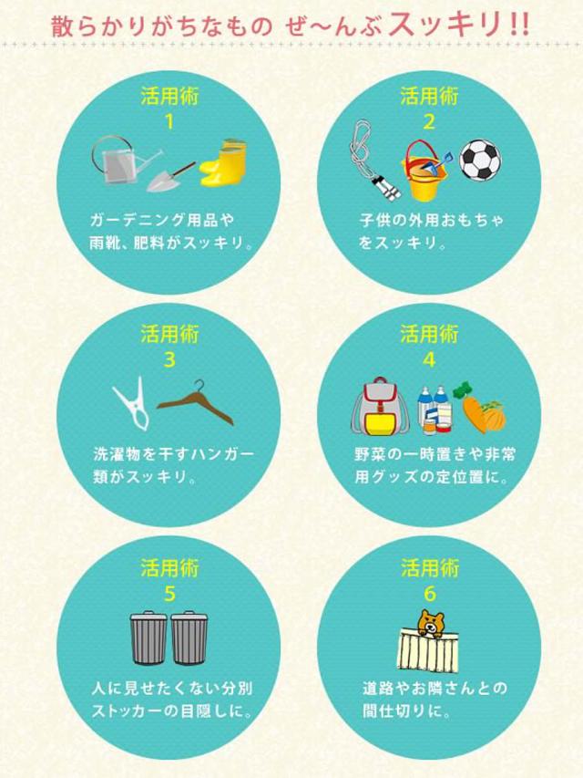ガーデニング用品、お掃除グッズ、お子様の外用おもちゃ、アウトドアグッズ等をまとめて収納できます。見た目以上に収納力があるので、お庭がスッキリと片付きます。
