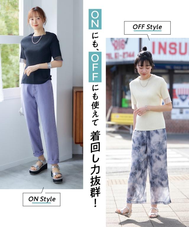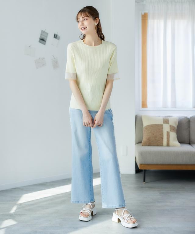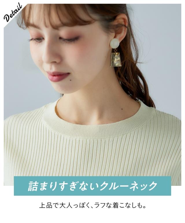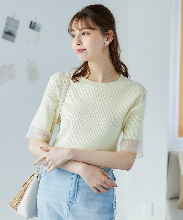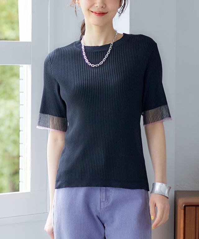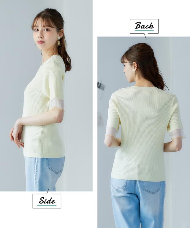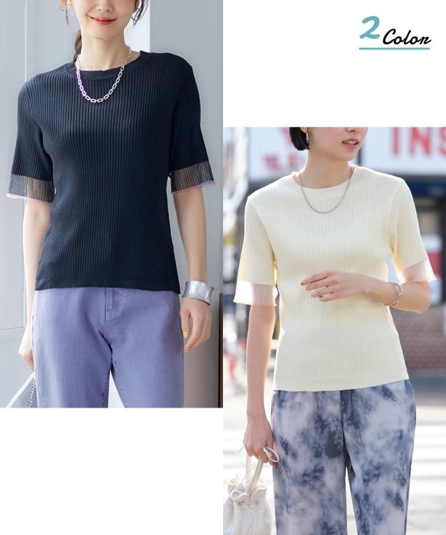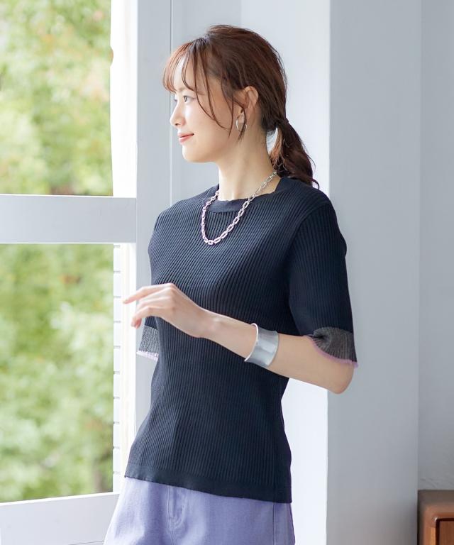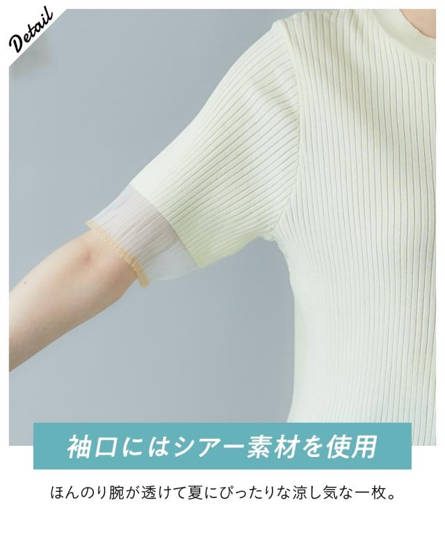 袖口のシアーと配色がポイント。優秀リブニット ■デザイン シアー素材の袖口で、涼やかさを演出できる女性らしいリブトップス。シンプルなシルエットながら袖口の配色がアクセントに。デニム合わせのカジュアルスタイルからオフィスでのきれいめスタイルまで、大活躍すること間違いなし ■素材 肌ざわりの良い、春夏に嬉しいサラッとしたリブ素材。気になる身体の線は拾いにくいサイズ設計にしています。 ■おすすめのスタイリング ティアードスカートやデニムと合わせるだけで旬コーデに。ウエストインですっきり着ると、女性らしさのあるスタイリングに仕上がります。サロペットやキャミソールのインナーとして合わせても袖口部分がポイント見えして 普段使いからオフィスシーンまで幅広く活躍する1着です。