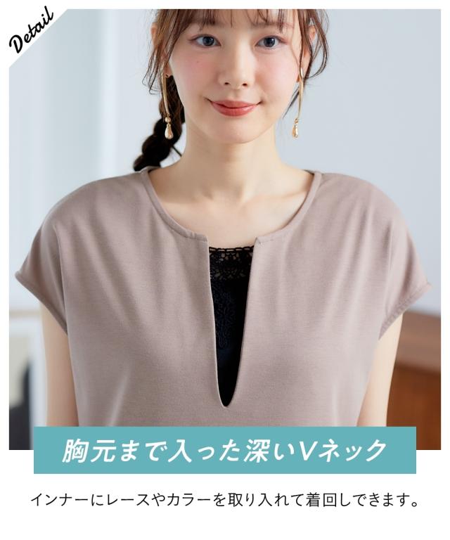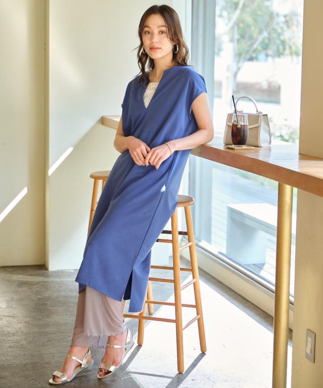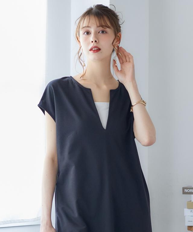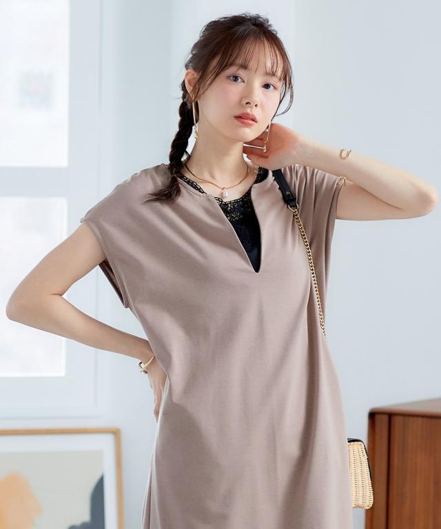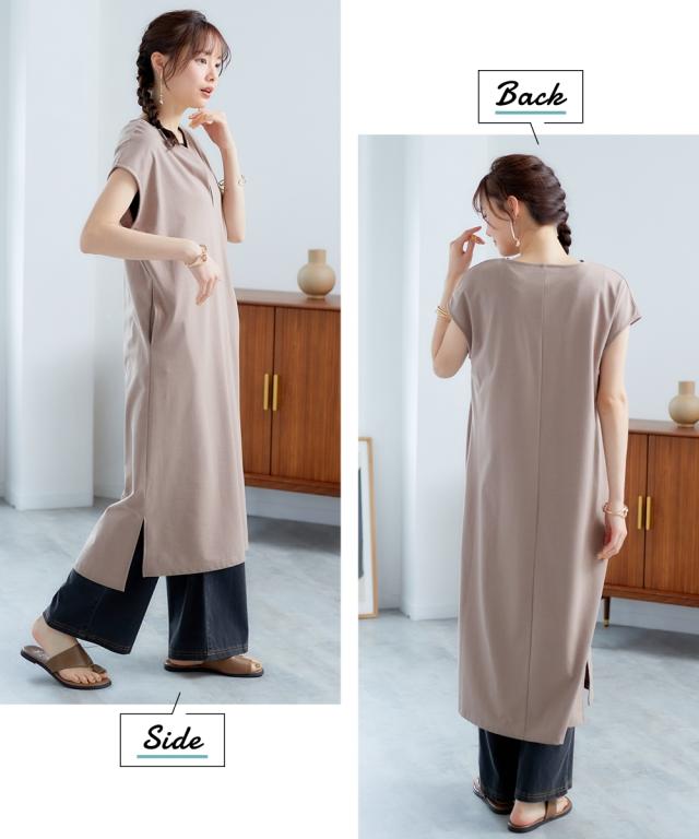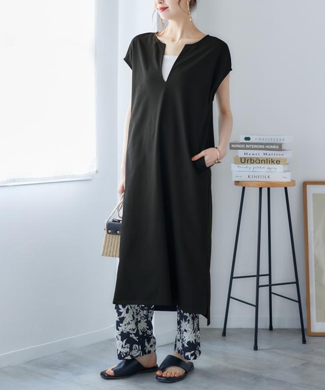 夏のレイヤードコーデが楽しめる。カフタン調ワンピース ■デザイン 深めのVネックで大人っぽく、裾は前後差をつけたサイドスリット入りで動きのあるシルエットを再現しました。丈感はボトムレイヤードをしたときにバランスよく見える長さにこだわりました。もちろん1枚で着用もOK。Iラインシルエットだから、こなれ感を出しつつ華奢見え効果も期待できます ■素材 落ち感のあるカットソー素材。なめらかで微光沢感もあるので高見え効果も。 ■おすすめのスタイリング 今っぽく、レイヤードを楽しめるワンピース。インナー次第で気温に合わせた着こなしができ、春秋までローングシーズン活躍する優秀アイテム。ボトムレイヤードしやすい丈感だからシアーボトムやリゾート柄のボトム、もちろんデニム合わせもセンスよく決まります。肌寒くなってきたらロンteeやタートルトップスと合わせたてブーツを合わせれば秋コーデの完成です。