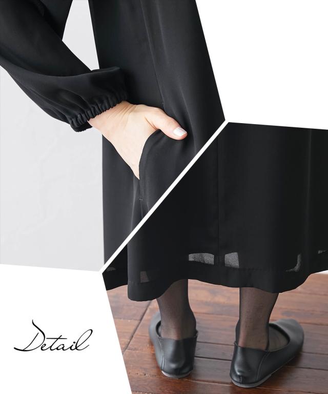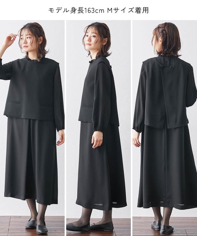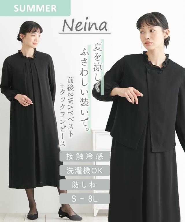 あなたらしいベストスタイルを見つけて。 ナチュラルさんらしい丁寧な装いの新しいブラックフォーマルです。 〜【Neina(ネイナ)】 for Black Formal〜 ■こだわりポイント 2WAYベストとワンピースのナチュラルアンサンブルです ベストは前後2WAYなので気分に合わせて着用いただくことができます ワンピースは首元のちびフリルが可愛いゆったりシルエット ジャケットはころんとした丸ボタンがアクセントになっています 接触冷感生地を使用しているので夏場に嬉しいサラッとした肌触り ふとした時に、さっと小物を収納できるポケット付きです ※ポケットはベスト(片面)・ワンピース両方にございます 立ったり座ったりしても安心なしわになりにくい生地 洗濯機(ネット使用)なのでおうちで簡単にお手入れできます お通夜やお葬式だけの喪服ではなく、結婚式・参観日・卒業式などすべてのフォーマルシーンに対応できるワンピースです ■体型カバーポイント からだの気になる部分をしっかり包み込んでカバーしてくれるシルエットスタイルです 気になる二の腕やお腹まわりもしっかり包み込んでくれます