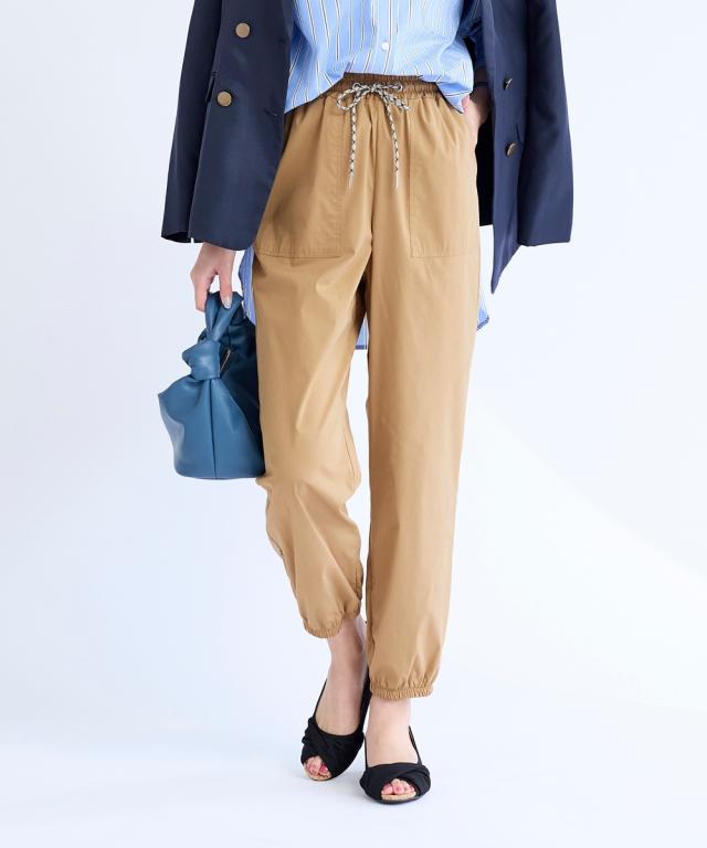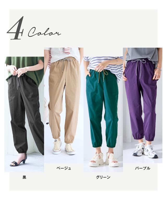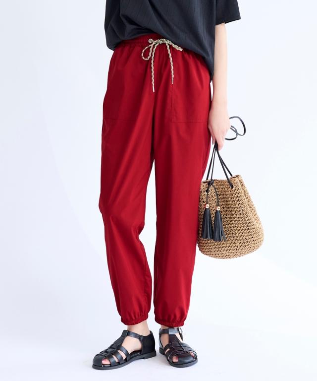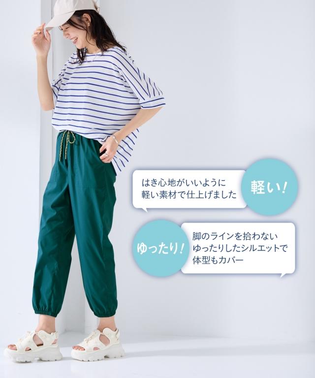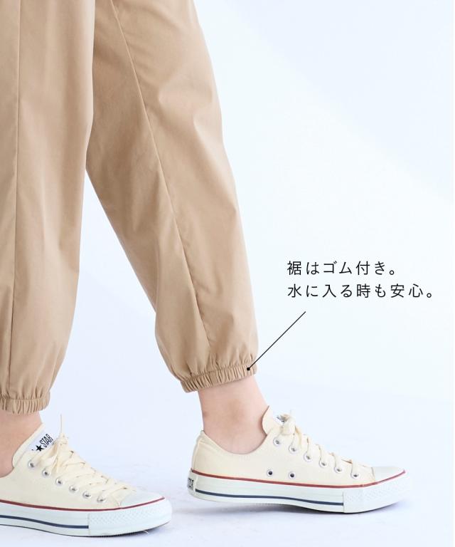 【この夏は水陸両用パンツに決まり。夏を思いっきり楽しめるパンツ登場。】 水陸両用素材で街でもプールでも海でも色々使える多機能万能パンツ。 耐塩素素材だから水に濡れてもOK。速乾性があるので水辺でも快適でストレッチ性もあるのでアクティブに楽々な印象。。 機能性×ファッション性を備えているから・・・オシャレ着として、海(プール等)で遊んだ後、そのまま買い出し…などもできる。 もちろん、スポーツなどアクティブにも過ごせるパンツ。 水着の上にサッとはくのにも便利でタウンユースにもピッタリな薄手素材です。 シルエットはお尻や太ももをうまく隠せるルーズシルエットライン。裾をジョガーにすることでトレンド感のある印象に。 リラックスしたはき心地で、体型もカバー。