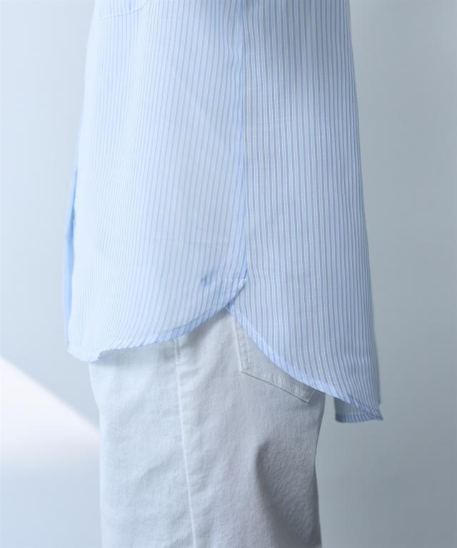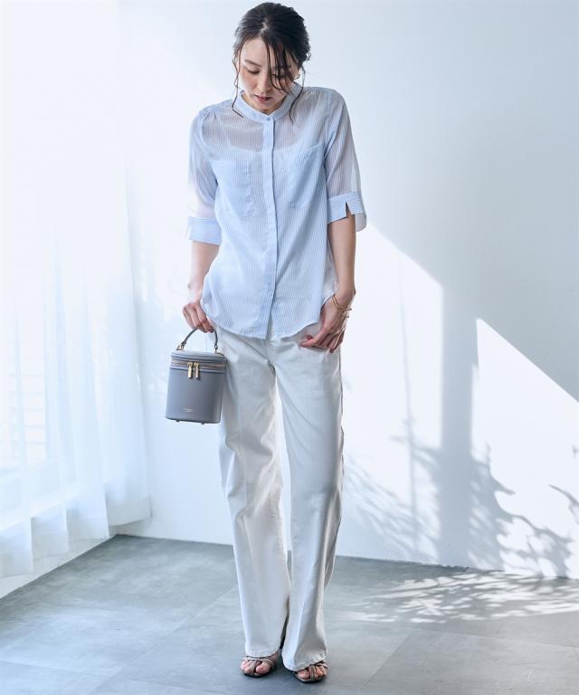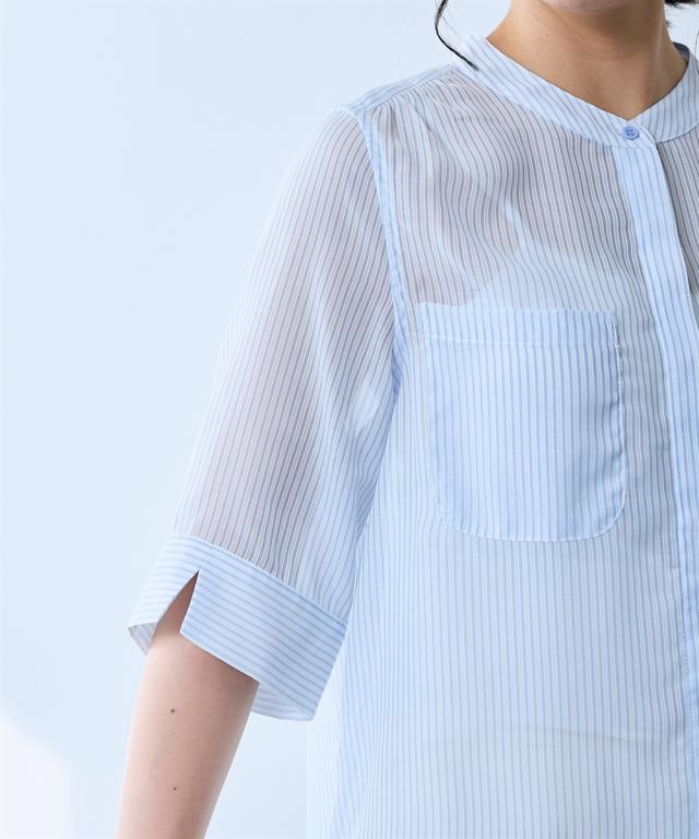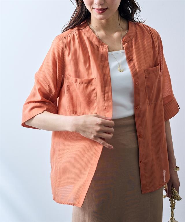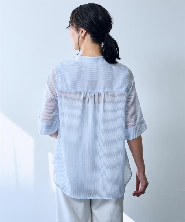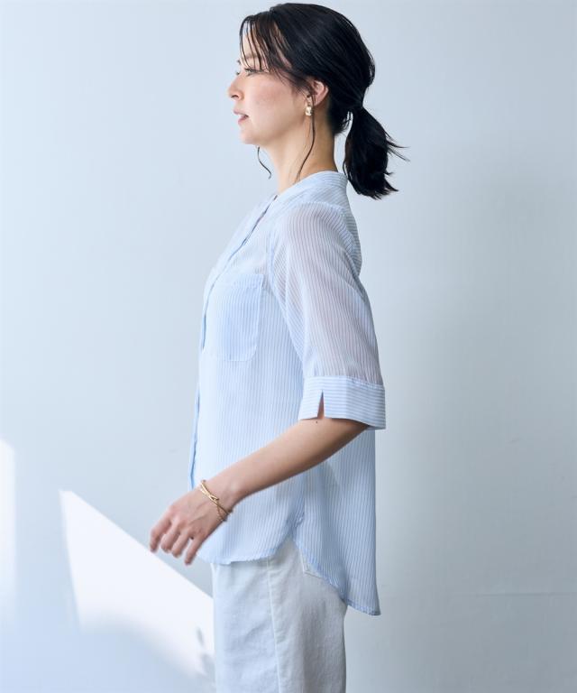 〜 『今』の私を素敵に輝かせてくれるオトナのためのオトナ服 『今』を楽しみ活躍するオトナ世代にお届け トレンドを取り入れたデザインと、素材や着心地にもこだわった、『今』着たいアイテムを取り揃え 〜 真夏の暑苦しさを払拭する清涼感あふれるエアリーブラウス ■デザイン シアー感のあるストライプ柄が爽やかなブラウス。長めの半袖は気になる二の腕をカバーしてくれます。ボタンを開けて羽織としても着まわせる真夏に大活躍の1枚です。 ■素材 透け感を活かして夏の羽織アイテムに。シワになりにくく軽くて持ち歩きにも便利だから日よけ対策や冷房対策としも ■おすすめのスタイリング パンツ、スカートともに合わせやすい程よい丈感。キレイめなカジュアルコーデがお勧めです。