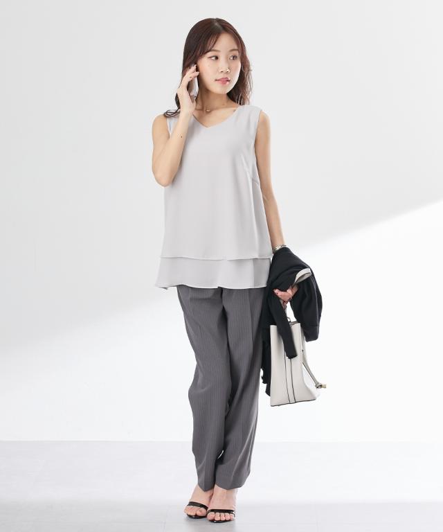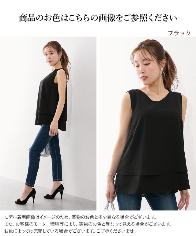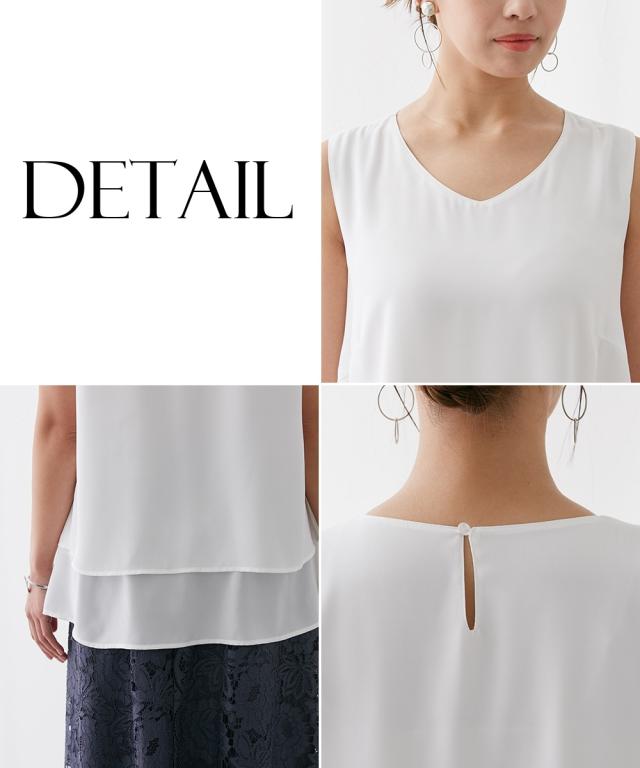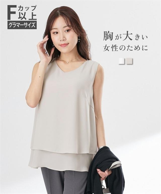 シャツ ブラウス レディース 大きい胸専用 Vネック 2枚重ねジョーゼット裾ティアード ノースリーブ M/L