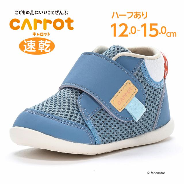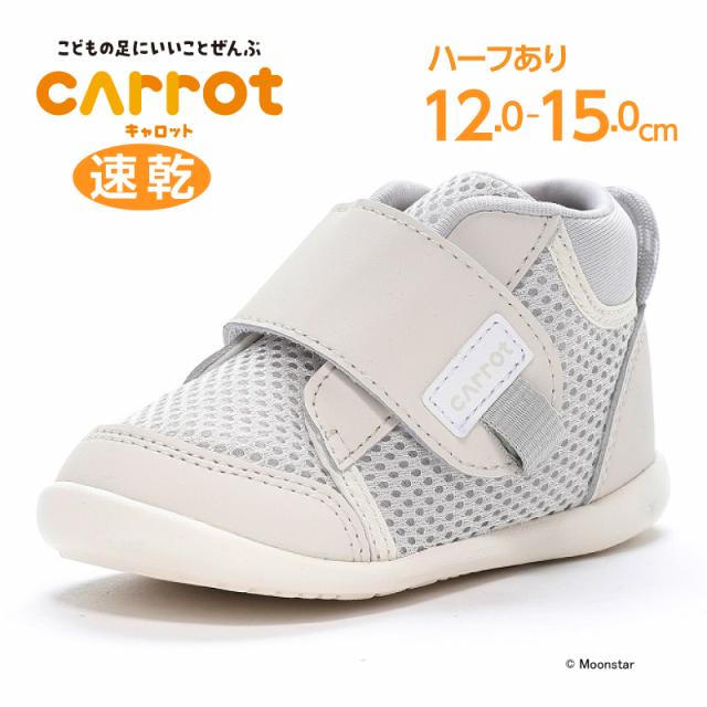 「こどもの足にいいことぜんぶ」の想いから生まれた機能シューズ「ムーンスター キャロット」の「速乾」ベビーシューズです。脱ぎ履きしやすい大きな甲バンドタイプです。ミニマムなパターンと素材使いで、視覚的にも速乾性が伝わるデザイン♪カラーはジェンダーレスを意識したニュアンスカラーをベースに差し色が目を引くベビーカラーの提案です。子どもの足の正しい成長をサポートする「4大機能(つま先ゆったり、カウンターボックス、フレックスジョイント、洗えるインソール)」により、健やかな成長を促します。中敷きにはサイズ選びに役立つ「サイズめやすゾーン」を搭載しています。重さは13.0cmで片足約80gです。【つま先ゆったり】つま先にゆとりを持たせた形状で、足の指を圧迫せずにのびのび動かせます。【洗えるインソール】足裏になじみ、取り出して洗濯ができるので靴内を清潔に保てる中敷きです。 【カウンターボックス】子どもの柔らかくゆがみやすい足を箱型構造でしっかり支えます。【フレックスジョイント】足の曲がりと同じ位置で靴が曲がる設計で、足に余計な負担をかけません。
