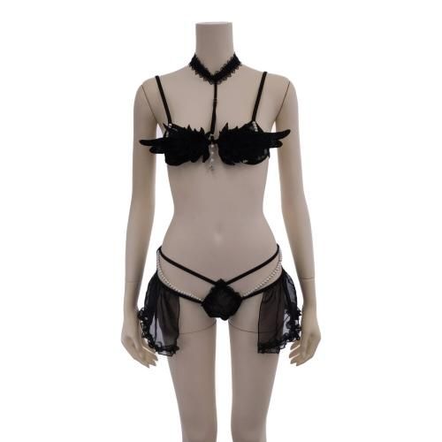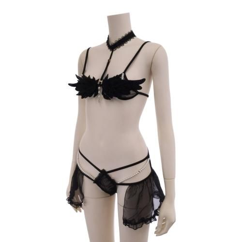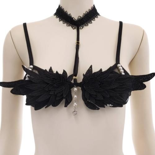 ブラにあしらった羽モチーフの刺繍に揺れるパールとビジューは可愛さを演出し、チョーカー一体型のデザインがほんの少しハード感を感じられるブラ・ショーツセットに仕上げました。