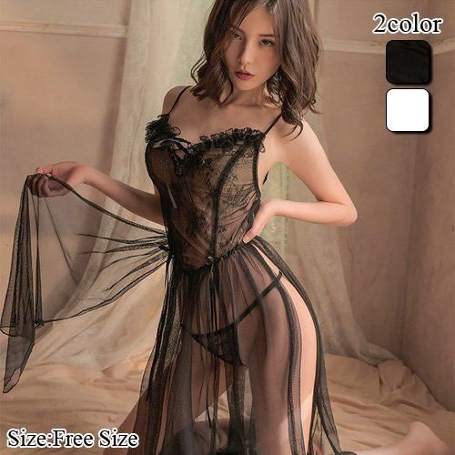 【グラシア】 ベビードール ベビド セクシー ランジェリー 下着 ネグリジェ エアリー ガーリー スリット チュール フレア ふんわり 肌魅せ ロング ドレッシー 繊細 大胆 肌見せ 透け感 レース 切り替え ブラック ホワイト フリーサイズ