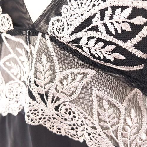 メッシュ生地の透け感と美しい刺繍が目を引き、裾に向かって広がっていくAラインが女性らしさを際立たせます。