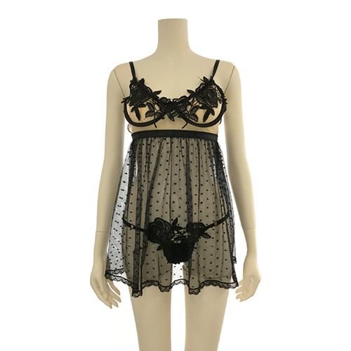 バスト部分とショーツ部分の大き目フラワーレースが印象的で、ドット柄のチュールが大人可愛いベビードールです。