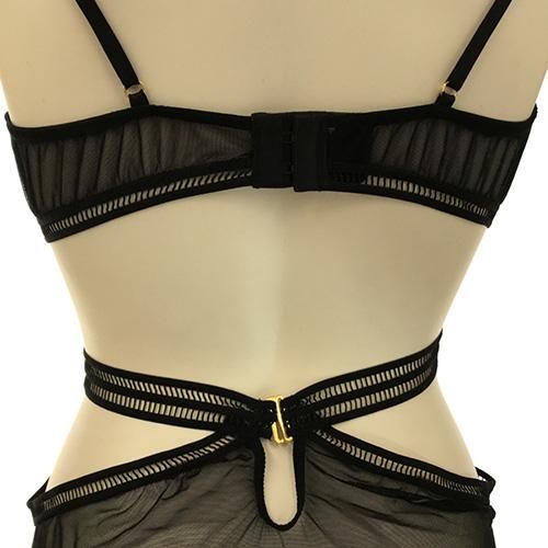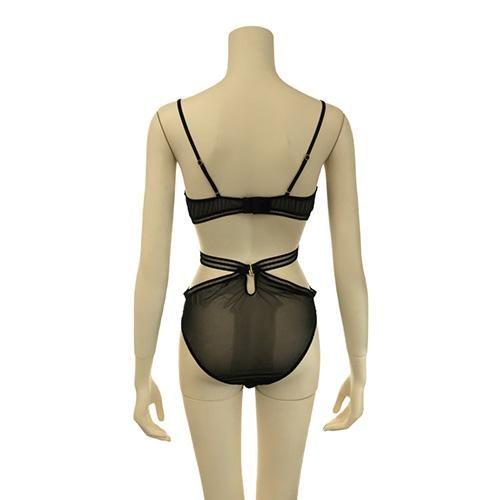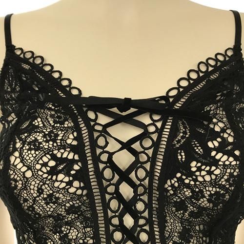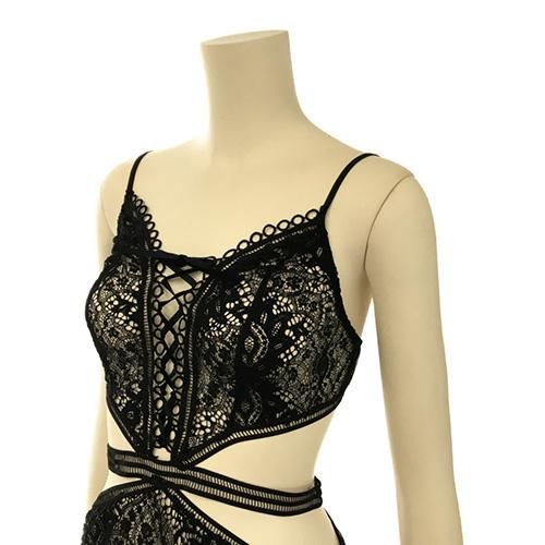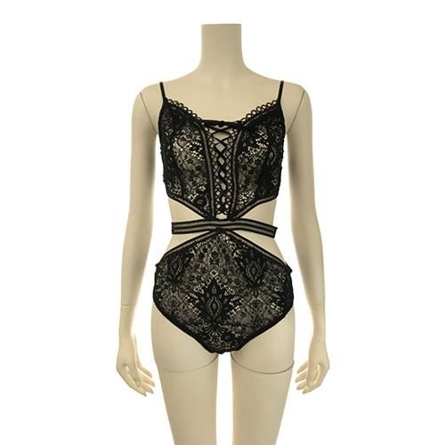 繊細なレースをフロント全体に使用し仕立てたヌーディーさを感じさせるモノキニデザインのテディは、曲線美を露にし胸元のレースアップでさらに大人の女性の色気をプラス。