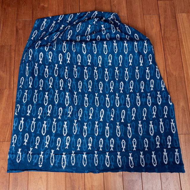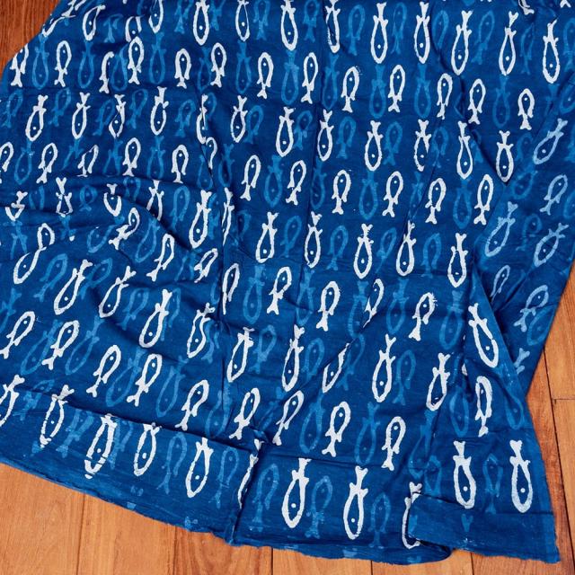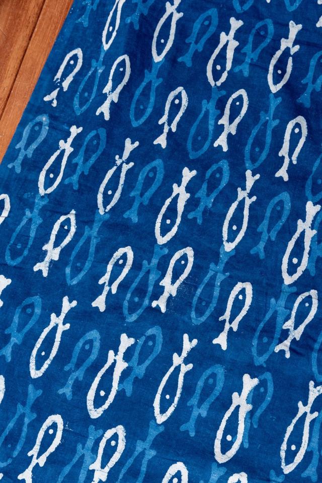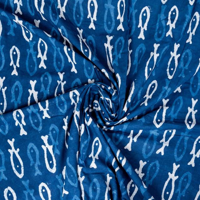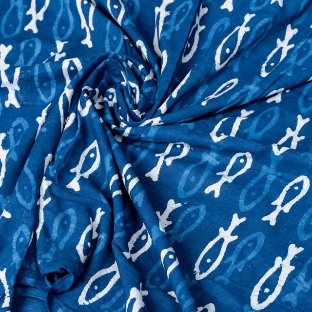 〔1m単位切り売り〕インドの伝統息づく 昔ながらの木版インディゴ藍染布 お魚 ネイビー系〔幅約110cm〕 / 商用利用可 フィッシュ サカナ 藍染め ウッドブロック アジアン コットン布 ファブリック エスニック