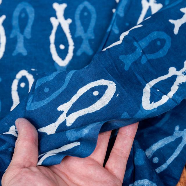 〔1m単位切り売り〕インドの伝統息づく 昔ながらの木版インディゴ藍染布 お魚 ネイビー系〔幅約110cm〕 / 商用利用可、フィッシュ、サカナ、藍染め、インディゴ、ウッドブロック、木版染め、ボタニカル、唐草模様、切り売り テーブルクロス おしゃれ、量り売り布、アジア布 手芸 布とファブリック 【インドとアジアンの布