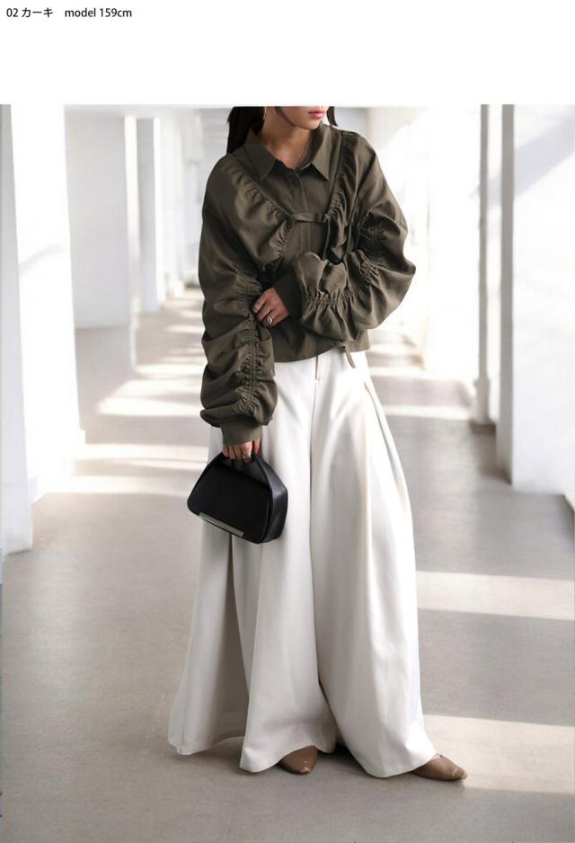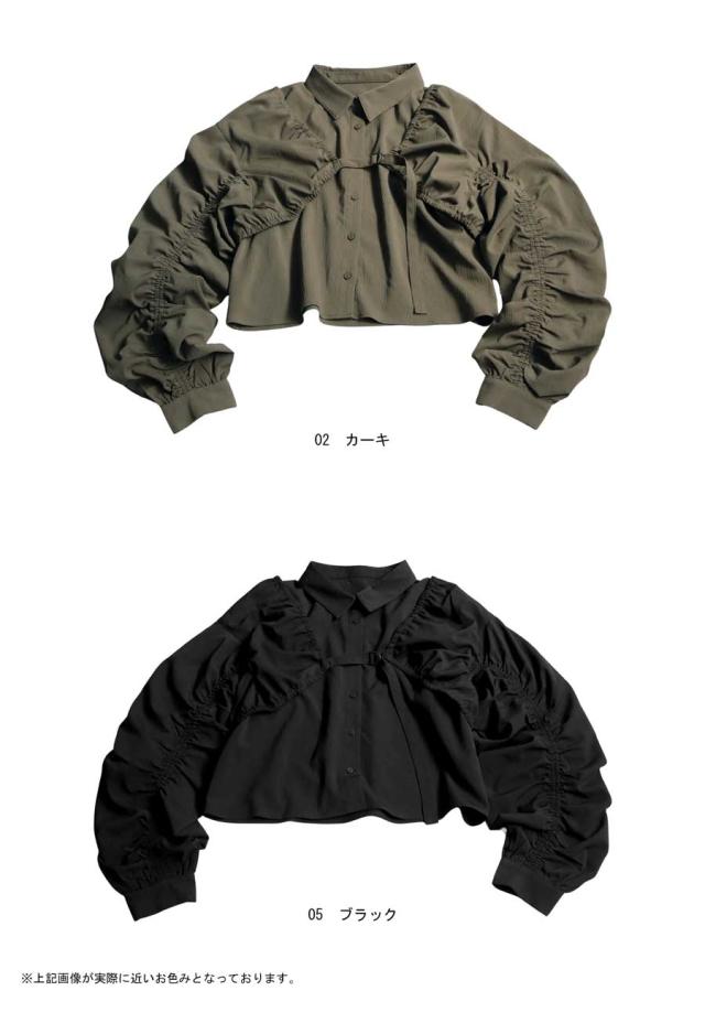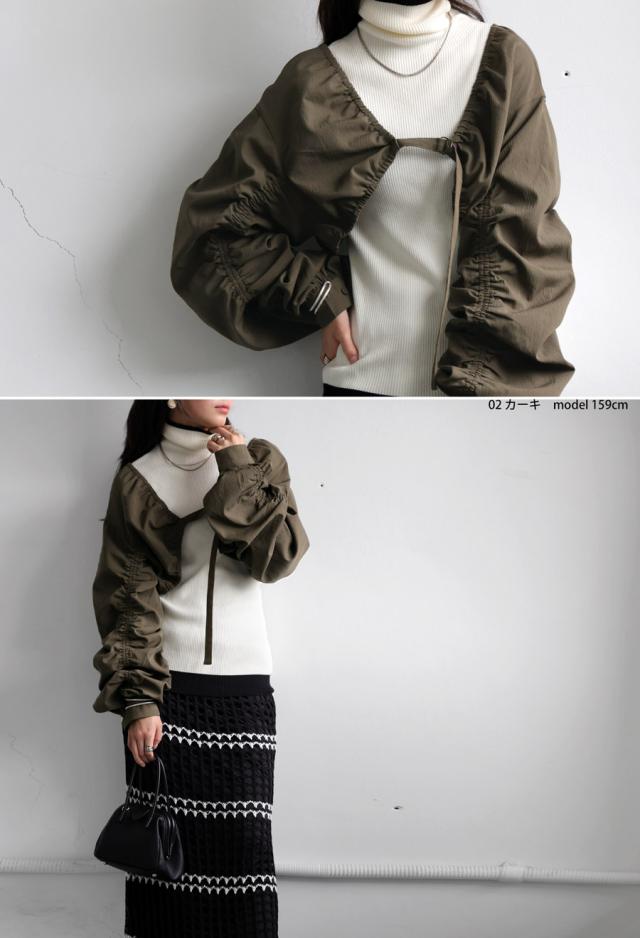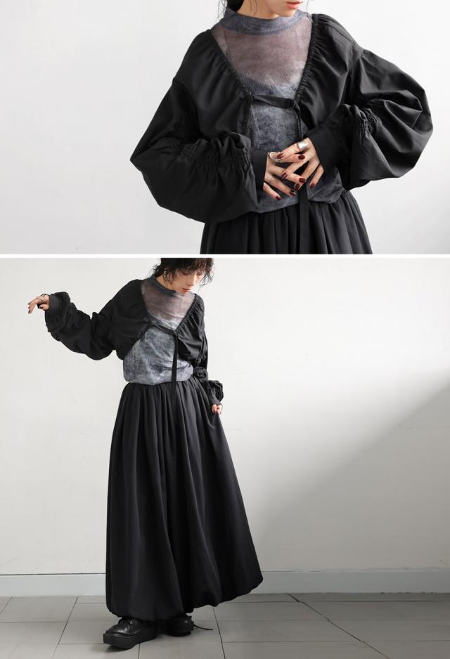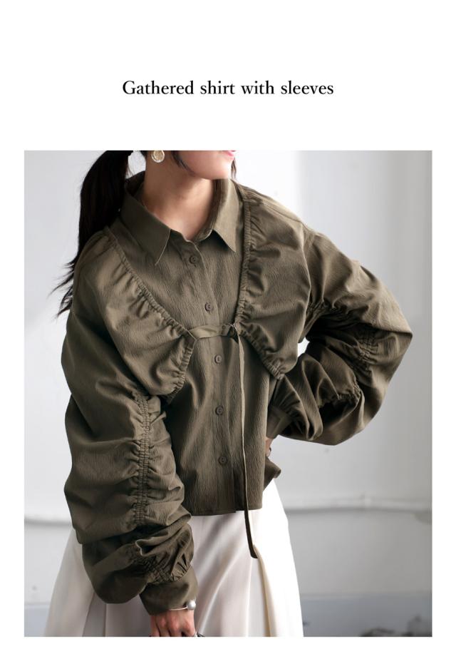 pk-01185 付け袖 長袖 ショート丈 レギュラーカラー 無地 前開き ボタン ベルト 調整可能 3WAY ギャザー レイヤード ゆったり シンプル モード ハイセンス 体型カバー 大きめ