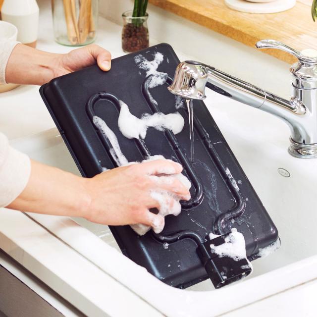 プレートはもちろん、本体についた汚れも水で洗い流せるので、いつでも清潔な状態で使えます。電源コントローラーの差し込み部分は防滴仕様になっています。