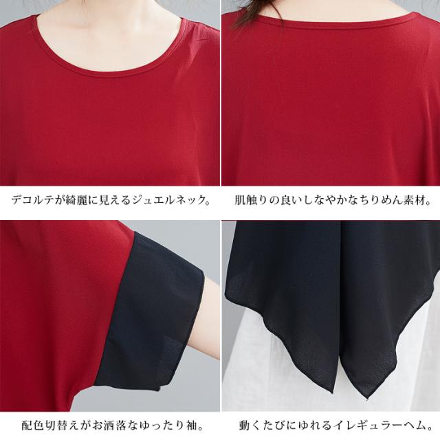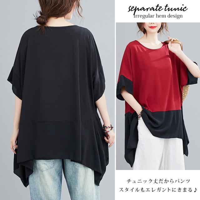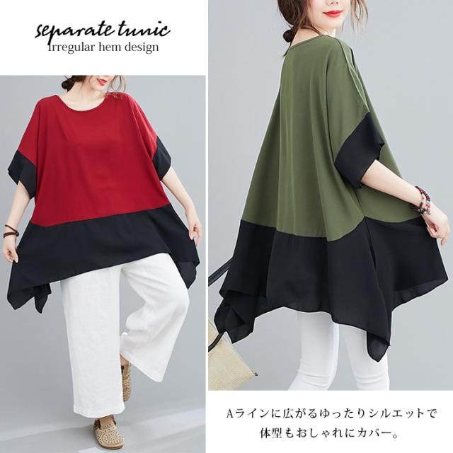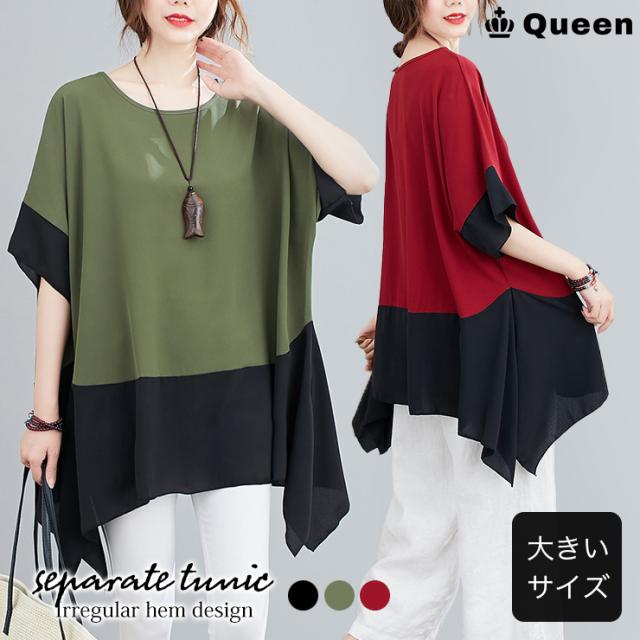 体型カバー プラスサイズ 配色トップス イレギュラーシャツ