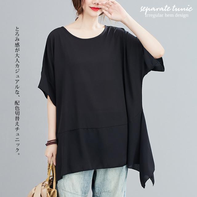 大きいサイズ レディース チュニックシャツ バイカラー ブラウス 黒 半袖 夏 (33727)