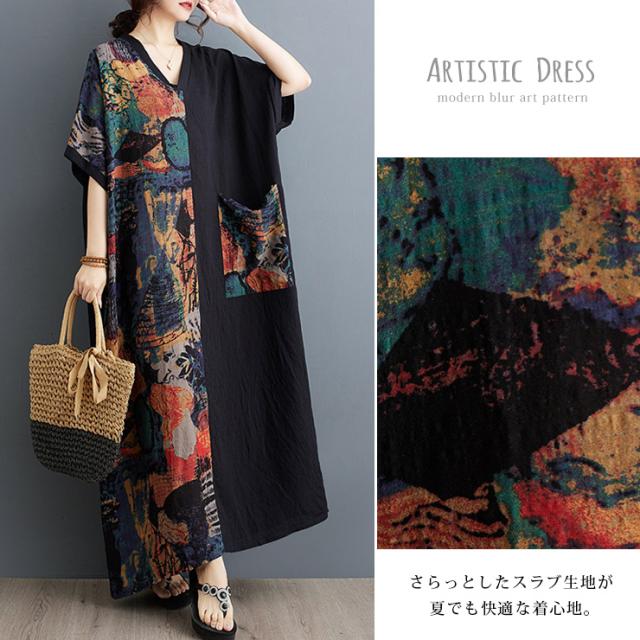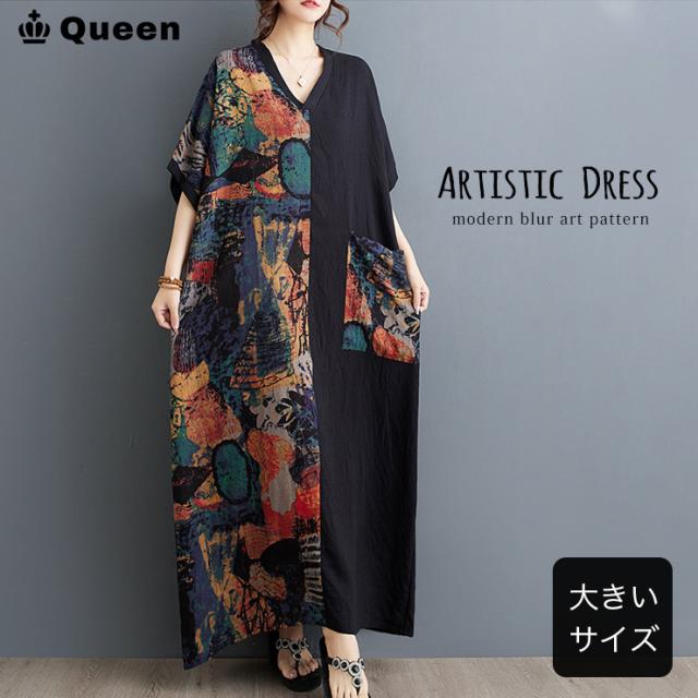 大きいサイズ レディース 切り替えワンピース マキシワンピ 半袖 ぼかし柄 Vネック 夏 (379806)