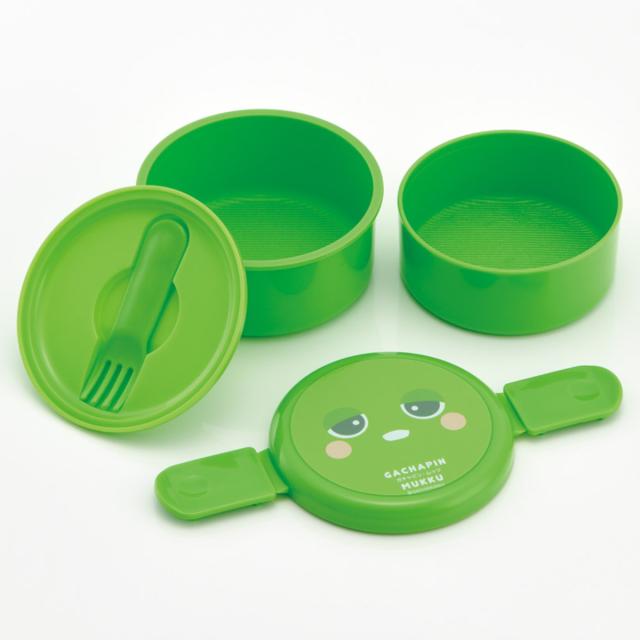 丸型のかわいい2段タイプのランチボックスです。プラスチック製のミニフォーク付きで別でカトラリーを持ち歩かなくても大丈夫です。食べ終わった後は、下段に上段を収納できる入れ子式で、コンパクトに持ち帰ることができます。