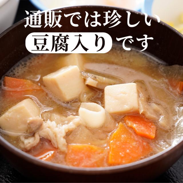 【原材料】玉ねぎ(中国産又は国産)、豆腐、米みそ、豚脂、豚肉(輸入)、にんじん、だいこん、れんこん、ごぼう、みりん、酵母エキス、砂糖、食塩、しょうが/調味料(核酸)、トレハロース、豆腐用凝固剤、(一部に大豆・豚肉を含む)