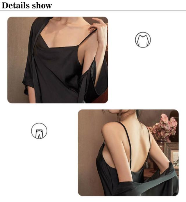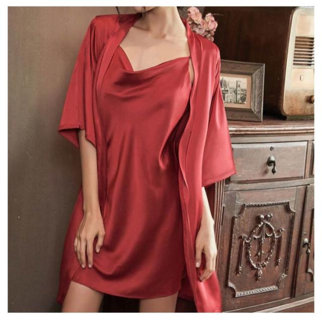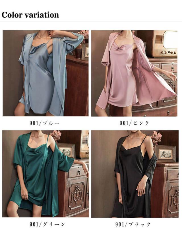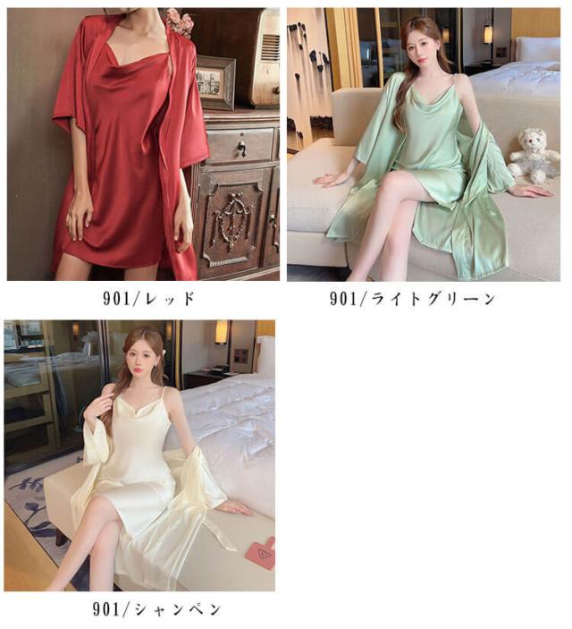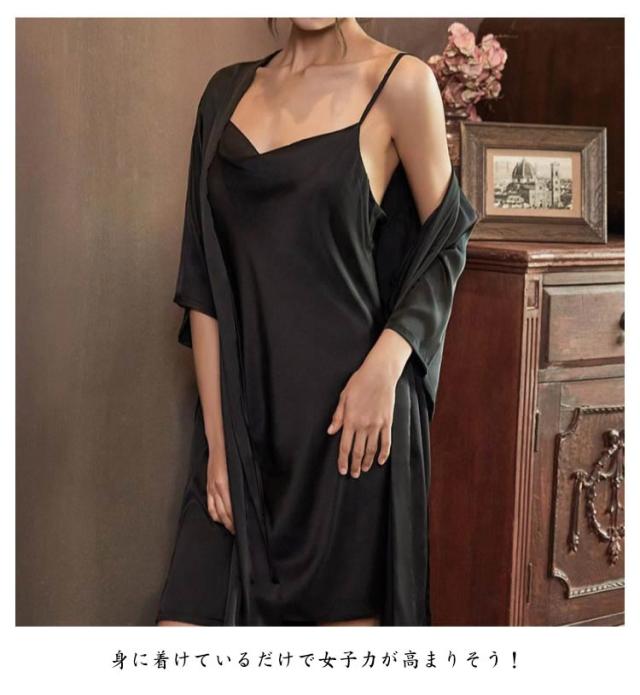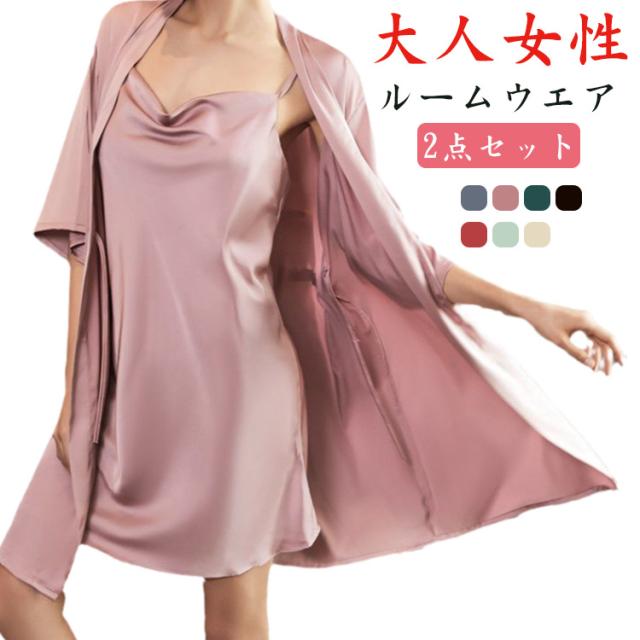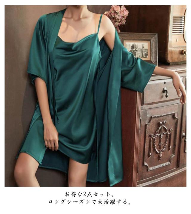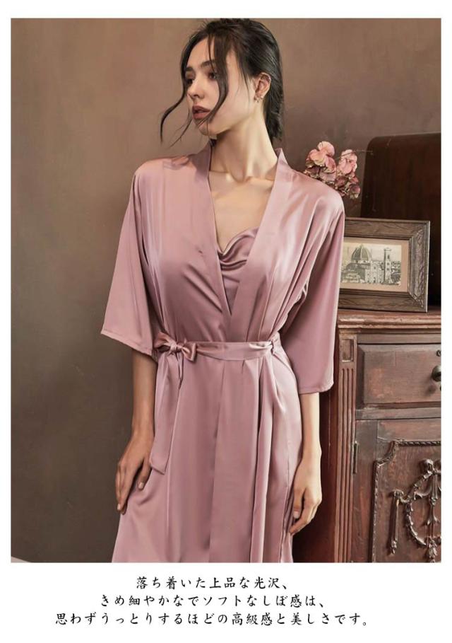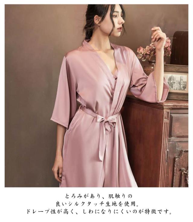 シンプル バスローブ ナイトウエア 2点セット シルクタッチ 光沢感 スリップ 春夏 ローブ 5分袖 キャミワンピース 高級感 秋 無地 パジャマ レディース ナイトウエア ガウン 寝間着 2点セット きれいめ セクシー 体型カバー