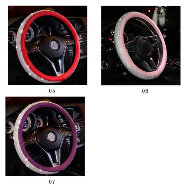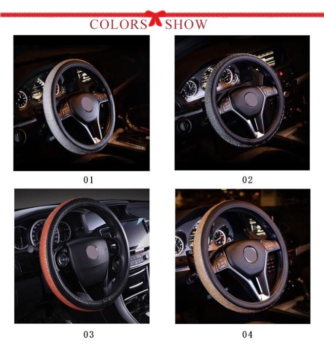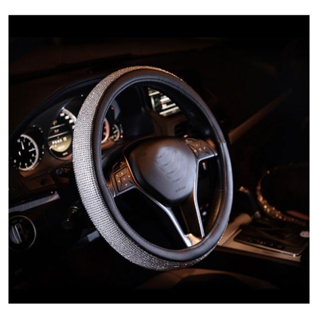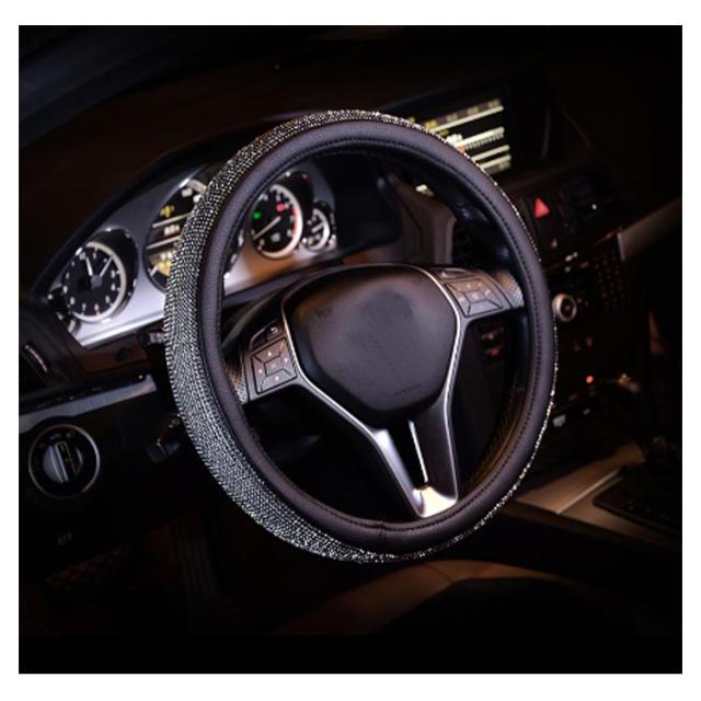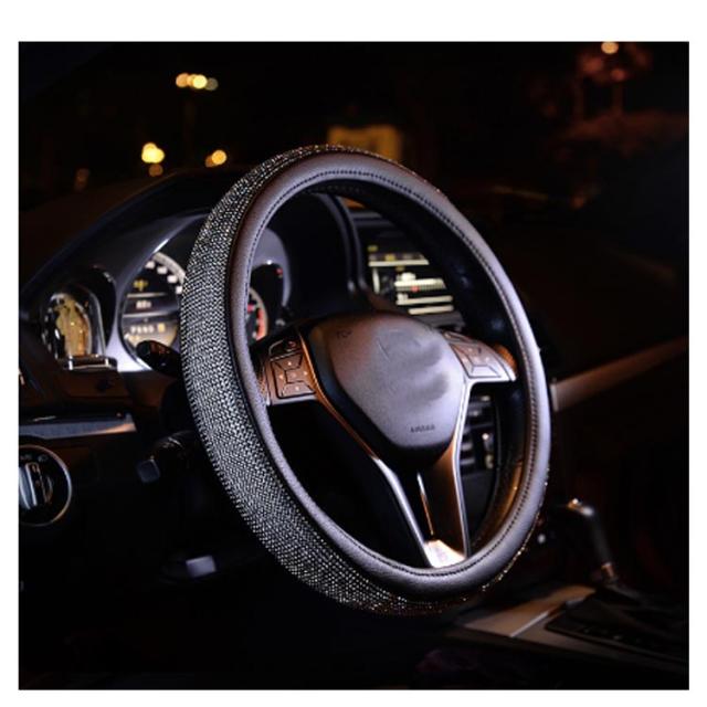 | 高品質のPUレザーとラインストーンのハンドルカバー。 フロントガラスを通してキラキラと愛車を輝かせひと味違うハンドルカバーをお探しのあなたに最適です。 クリスタルラインストーンが手のひらに程よい刺激を与え運転の疲れを和らげます。 カバーを取り付けると握りが太くなりグリップも良くなることで操作性がグンとアップ。 さらに滑り止め効果もあるので、運転中の安全を確保できます。 オールシーズン使用OK! ハンドルカバーを変えるだけで内装イメージが変わる。 | |