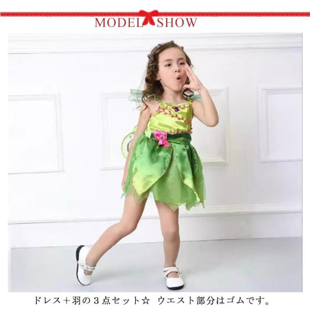 | ピーターパンのティンカーベルのような妖精のかわいい衣装です。 ドレス+羽の3点セット☆ ウエスト部分はゴムです。 パーティーに、イベントにいかがでしょうか(^^) | |
