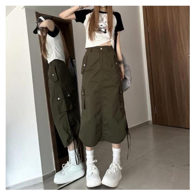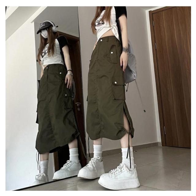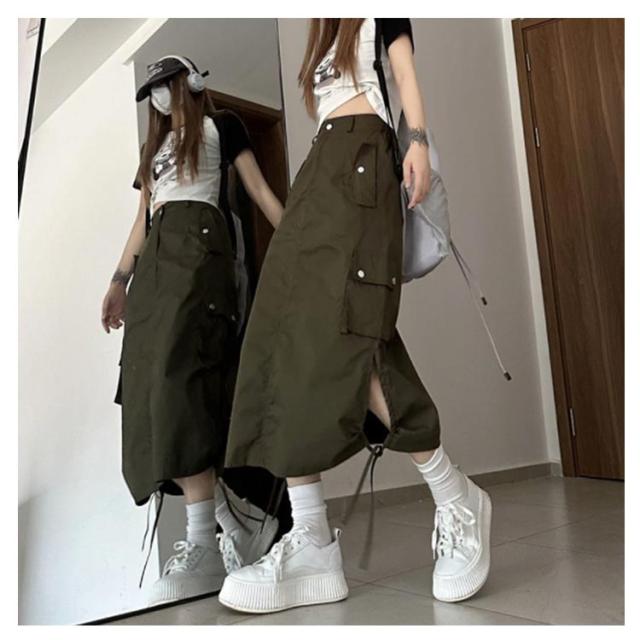 ミリタリー ゆったり シャーリング タイトスカート ロング丈 サイドドロストカーゴスカート カーゴロングスカート ベージュ カーキ ミリタリースカート ウエストゴム 綿 夏 レディース 春 サイドドロストカーゴスカート 秋