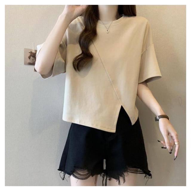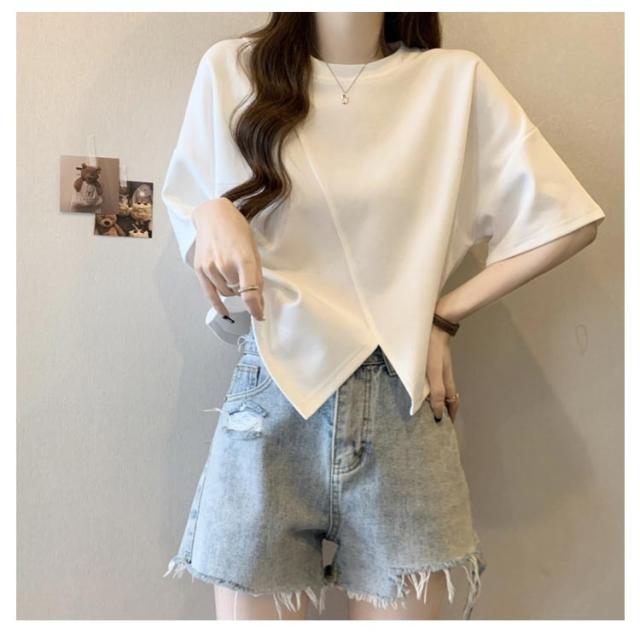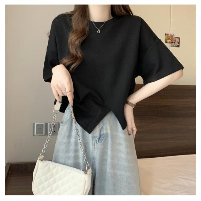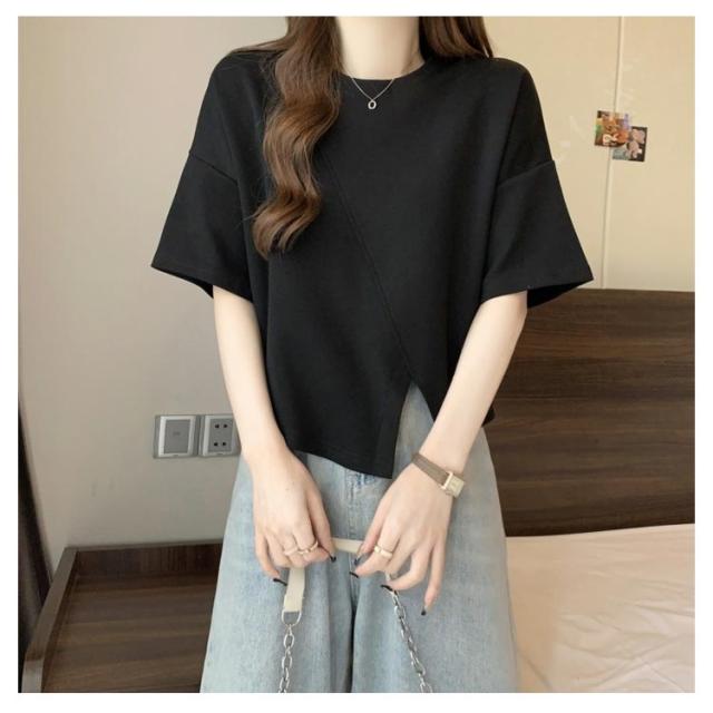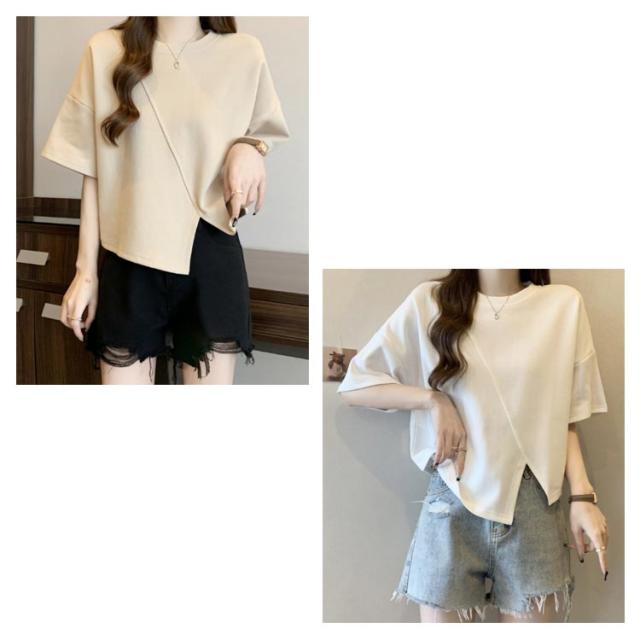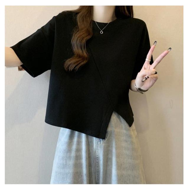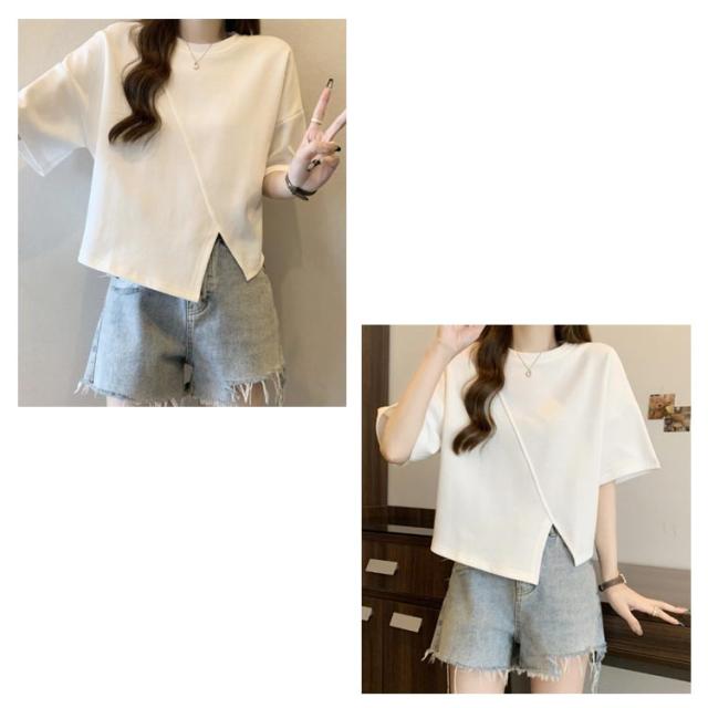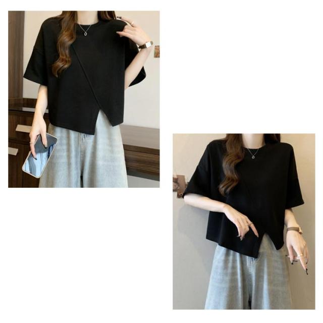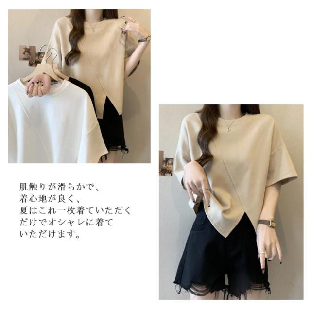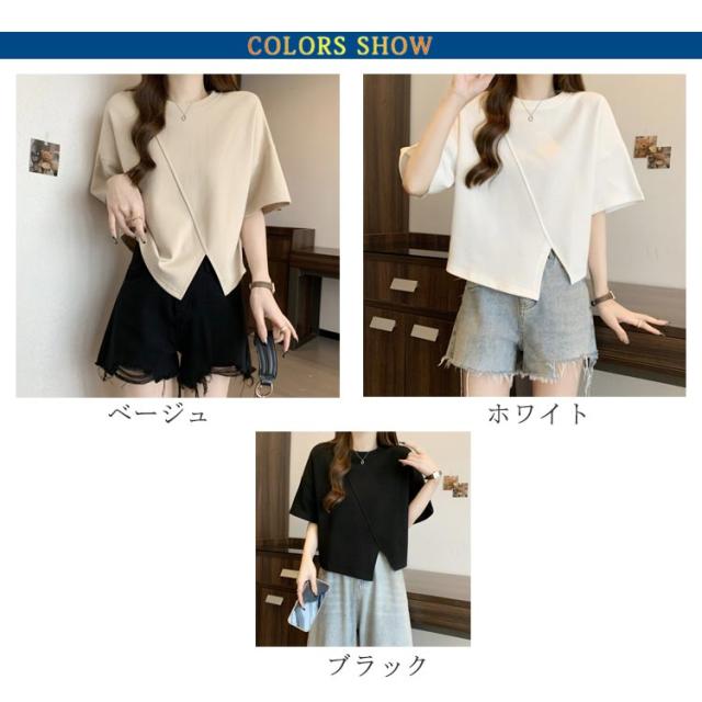 アシンメトリー Tシャツ レディース Uネック 半袖 着痩せ 半袖 スリット 夏 無地 シンプル カジュアル 二の腕カバー 変形 ラウンドネック 白 黒 トップス 春 カットソー