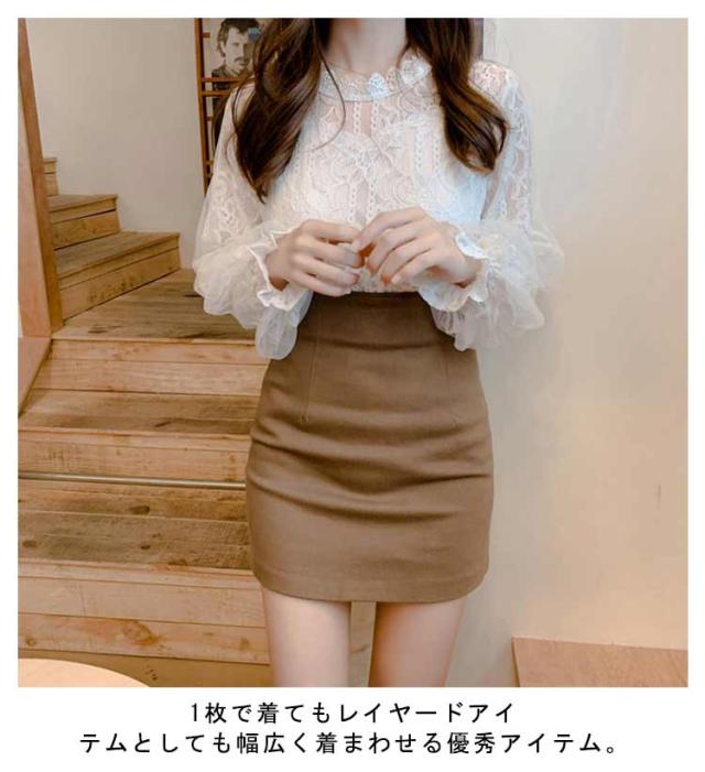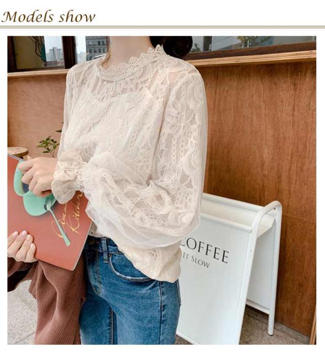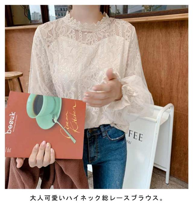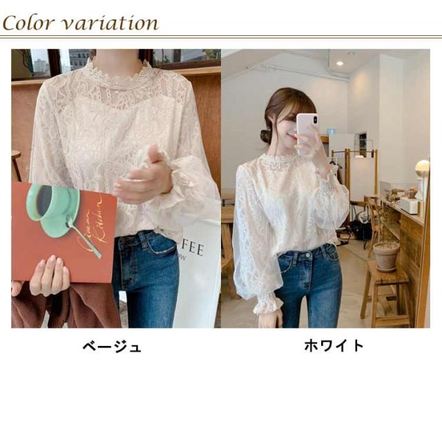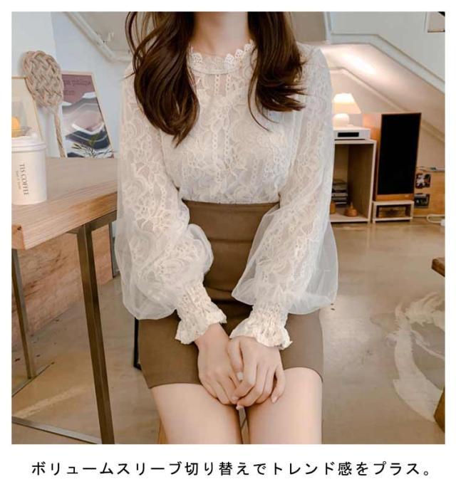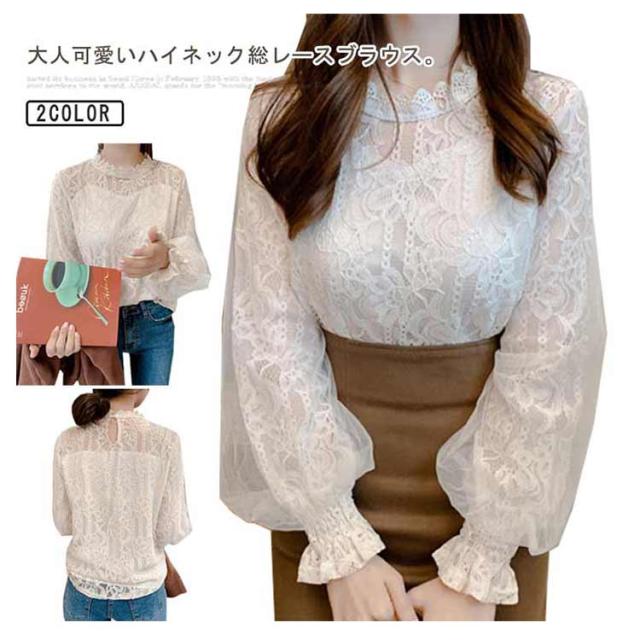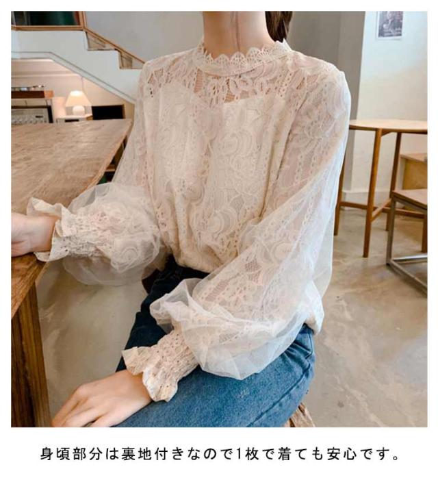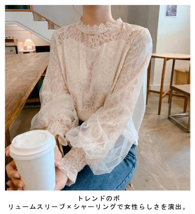 ブラウス シアー 春 シースルー 長袖 トップス 総レースブラウス 30代 レースブラウス ボリューム 大人可愛い シャツ きれいめ バルーン袖 夏 秋 冬 白 ベージュ 20代 ハイネック
