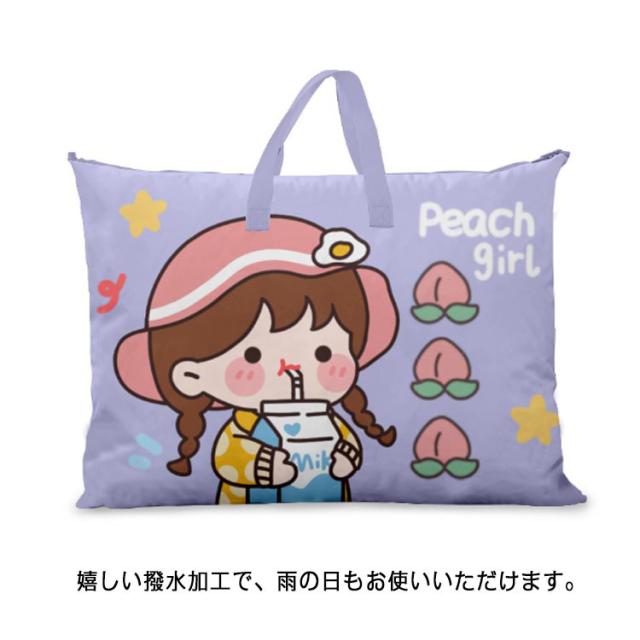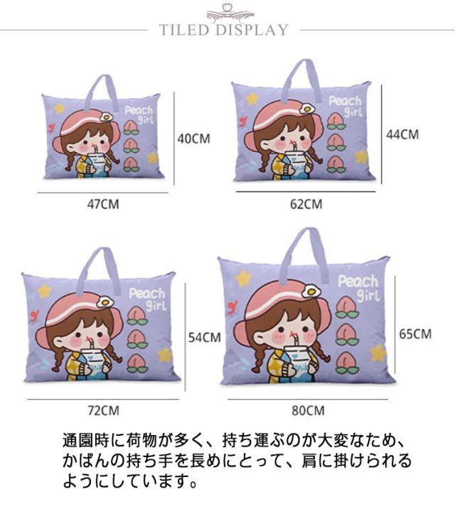 | お子様が好む可愛いデザインのお昼寝布団バッグ! 通園時に荷物が多く、持ち運ぶのが大変なため、かばんの持ち手を長めにとって、肩に掛けられるようにしています。 そうしたら、両手が空くので、お子様を抱っこしたり他の荷物を持つのも楽になります。 嬉しい撥水加工で、雨の日もお使いいただけます。 大容量バッグなので、布団収納、アウトドアや旅行、帰省など荷物が多い時にも利用できて、卒園後も長くお使いいただけます! | |