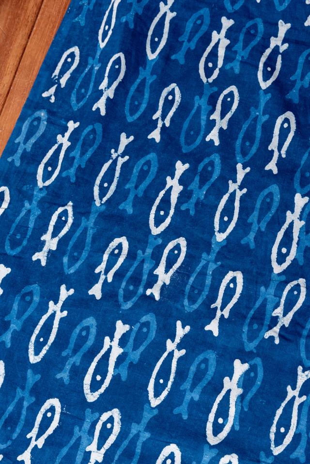 【3個セット】〔1m単位切り売り〕インドの伝統息づく 昔ながらの木版インディゴ藍染布 お魚 ネイビー系〔幅約110cm〕 / セット、フィッシュ、サカナ、藍染め、インディゴ、ウッドブロック、木版染め、ボタニカル、唐草模様、切り売り テーブルクロス おしゃれ、量り売り布、アジア布 手芸 布とファブリック 【インドとアジアンの布