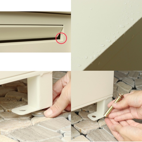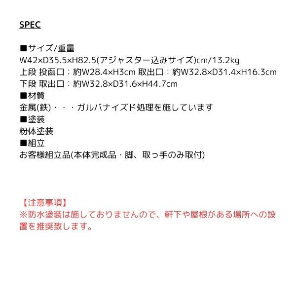 【注意事項】 ※防水塗装は施しておりませんので、軒下や屋根がある場所への設置を推奨致します。 ■カラー アイボリー ■サイズ/重量 W42×D35.5×H82.5(アジャスター込みサイズ)cm/13.2kg 上段 投函口:約W28.4×H3cm 取出口:約W32.8×D31.4×H16.3cm 下段 取出口:約W32.8×D31.6×H44.7cm ■材質 金属(鉄)・・・ガルバナイズド処理を施しています ■塗装 粉体塗装 ■組立 お客様組立品(本体完成品・脚、取っ手のみ取付) ※写真はメーカー様のカタログ等から掲載させていただいております。 実物の商品と写真の色が若干写真写り等により異なる場合がありますので、ご注意くださいませ。 万が一の際でございましても返品はお受けいたしかねます。 ※お客様組立て品につきましては、組み立て後に不良の連絡をされても対応ができません。 組み立て前にパーツに不良・傷等がないか、必ずご確認下さいますようよろしくお願い申し上げます。 ※記載は商品仕様の一部です。仕様説明不足等の理由での返品はできません。特に適合等は必ずご確認ください。