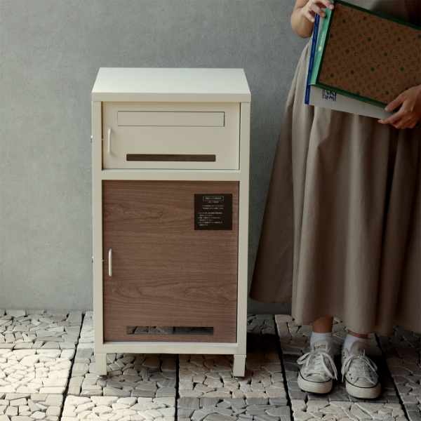 宅配ボックス ラウロ ポスト一体型 一戸建て 鍵付き おしゃれ W42×D35.5×H82.5cm 木目調 ゆうパケット スリット窓付き アイボリー