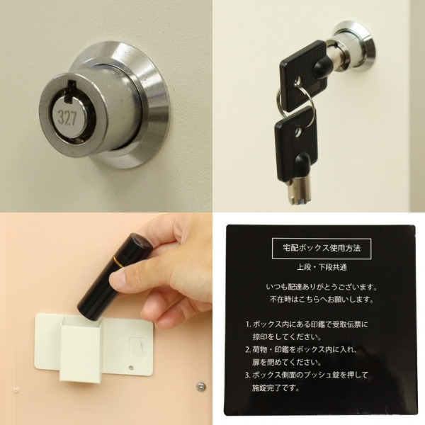 ・上段宅配使用:印鑑ケースは2個付属しており、上段の鍵もプッシュキーを使用しているので、上段も宅配ボックスとしての使用も可能です。