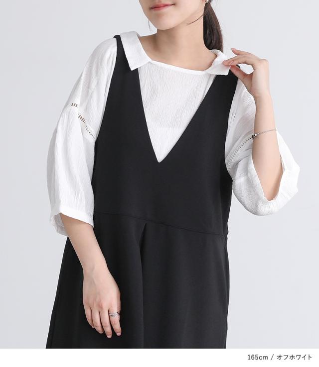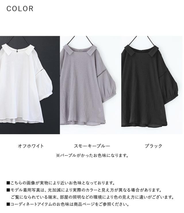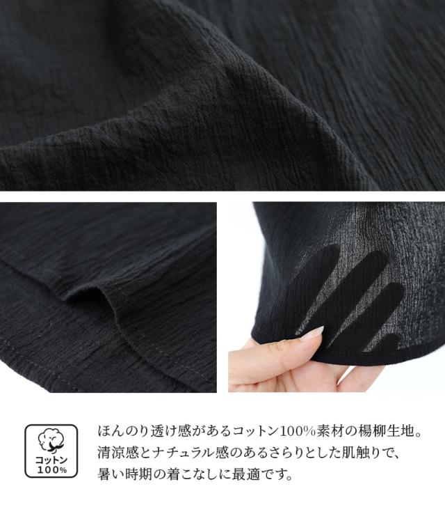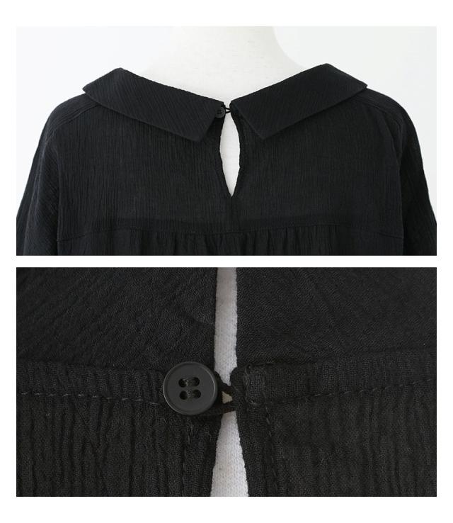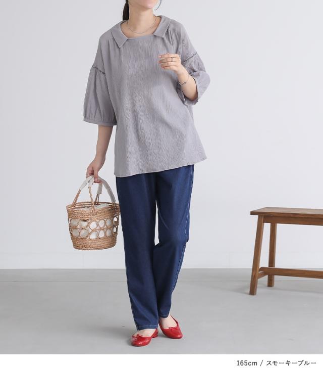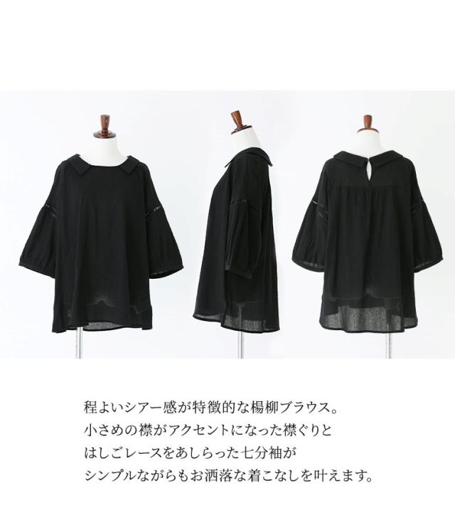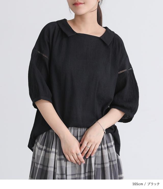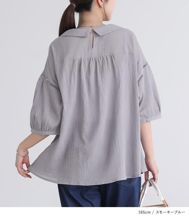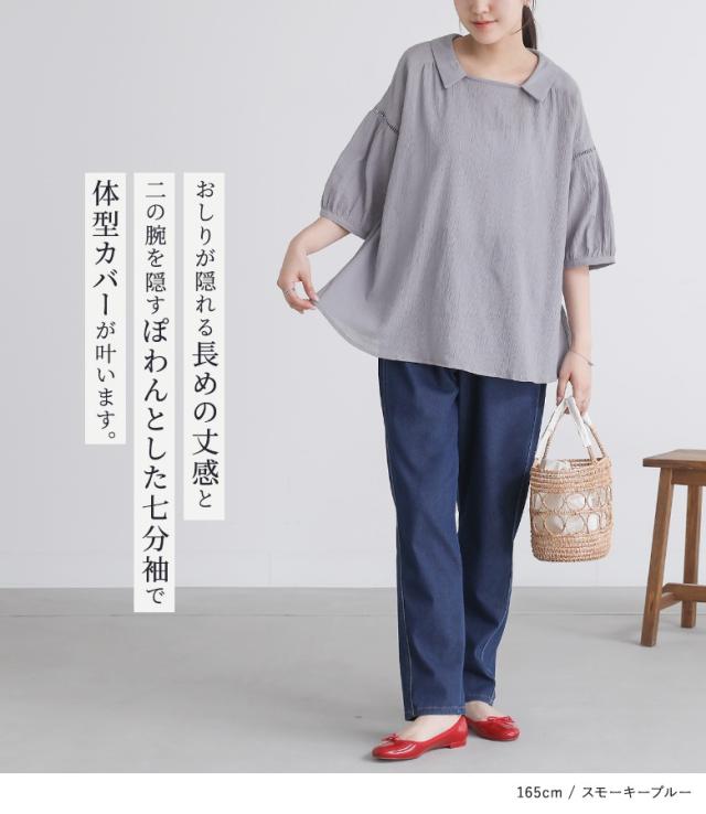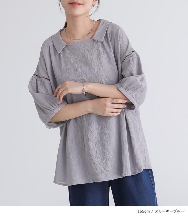 『プチ襟楊柳ブラウス』※メール便可※【5】[ブラウス トップス レディース 七分袖 シアー 透け感 清涼感 ナチュラル 楊柳 スクエアネック 襟付き スリット コットン100% 綿100%]