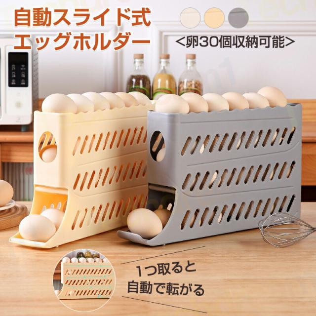 【自動スライド式エッグホルダー】: エッグホルダーは自動で卵を転がす機能があります。冷蔵庫やパントリーで卵を整理するのに最適です。