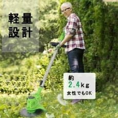 枝の剪定、雑草や芝生のお手入れにぴったりの軽量設計(約2.5kg)のコードレス草刈り機です。軽いので腕が疲れる事なく、女性やご高齢の方でも作業が楽に進みます。