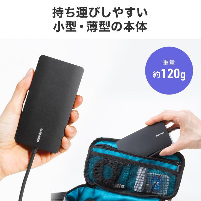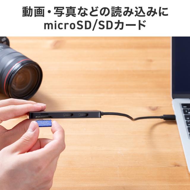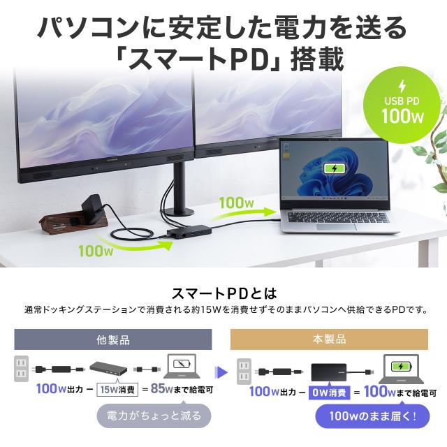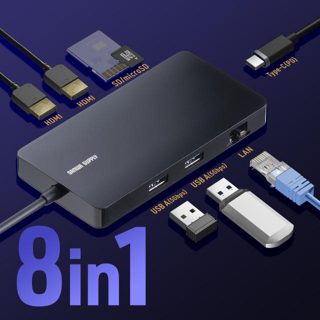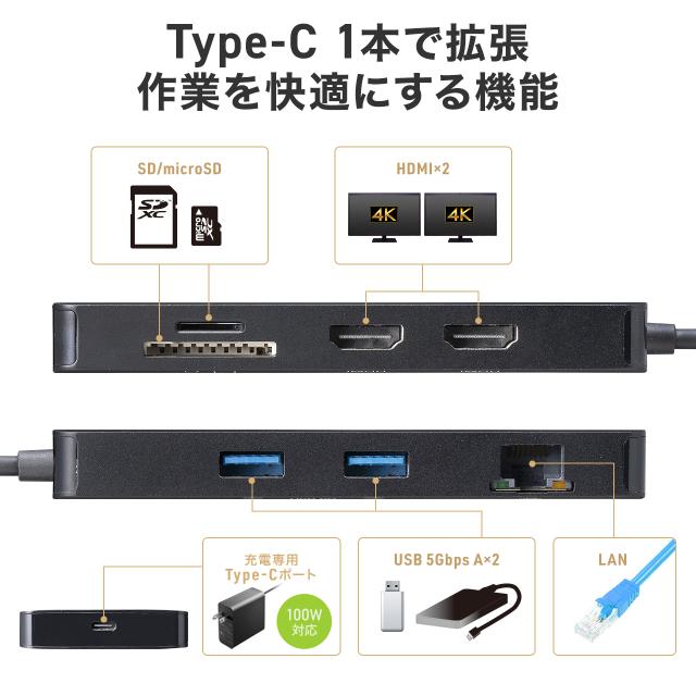 ●パソコンに安定した電力を送るスマートPD搭載のモバイルドッキングステーションです。●Type-Cケーブル1本でHDMI×2、USB A×2、Type-C(PD)×1、SDカード×1、microSDカード×1、LAN×1の拡張接続ができます。