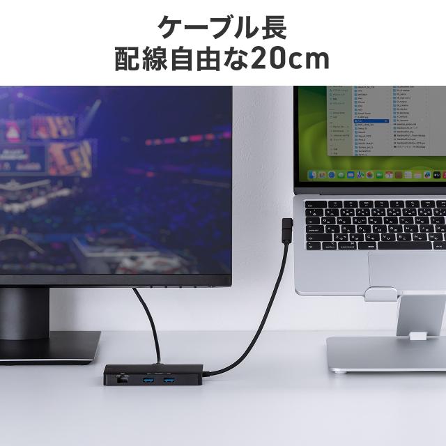 ドッキングステーション HDMI2つ 2画面出力対応 4K/60Hz対応 USB-C接続 USB PD100W スマートPD対応 カードリーダー 有線LAN L型アダプタ ケーブル長20cm[400-HUBCP25BK]