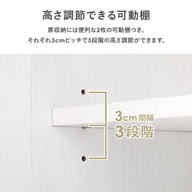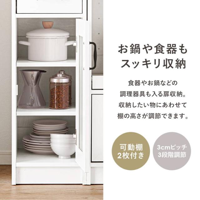 ●扉収納部には可動棚2枚付きで、調理器や食材、調味料などのストッカー等、収納物に合わせて高さ調節が可能です。