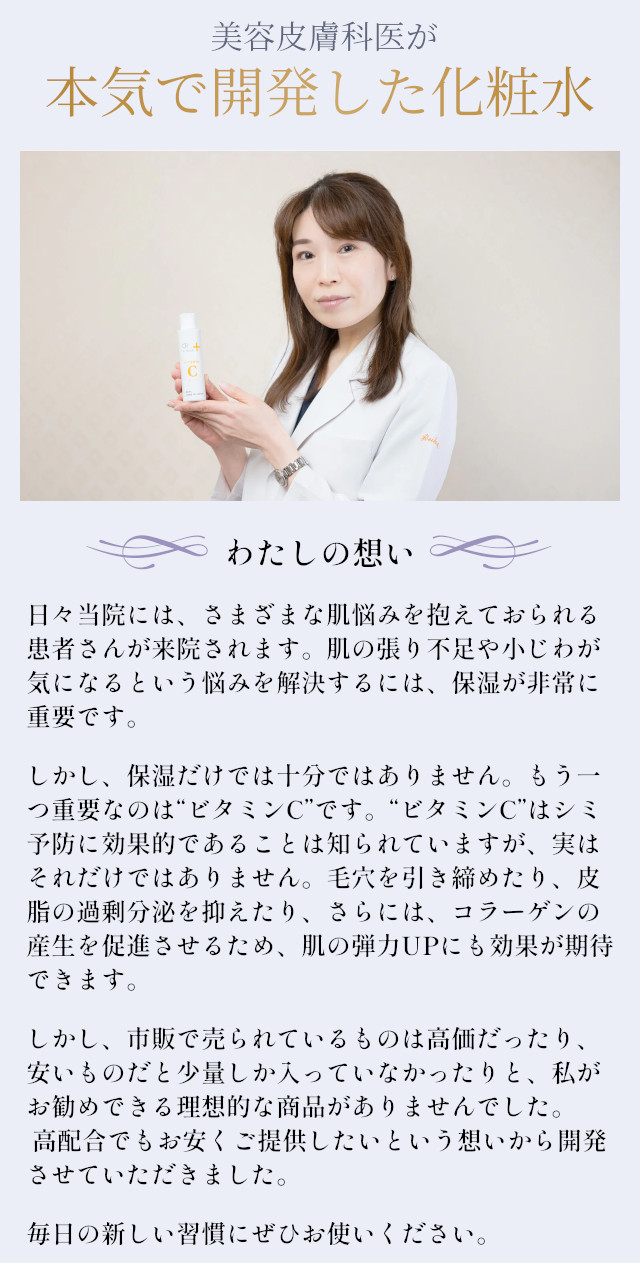 ビタミンC誘導体を10%と贅沢に配合し、真の潤い美肌へ導くローションです。