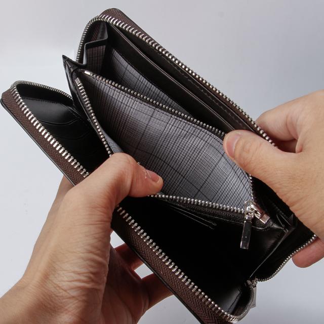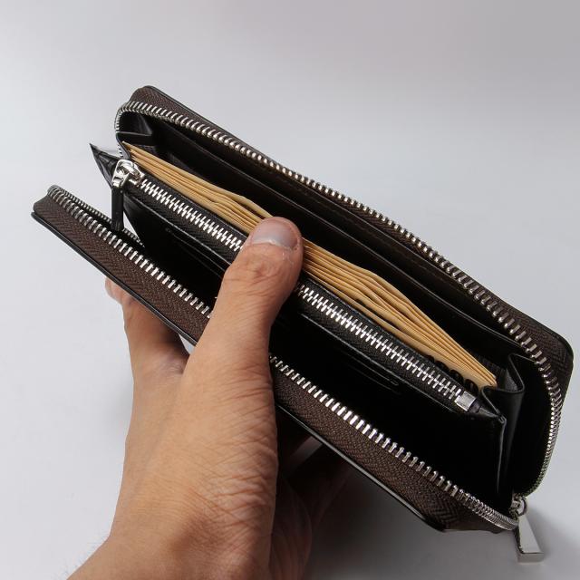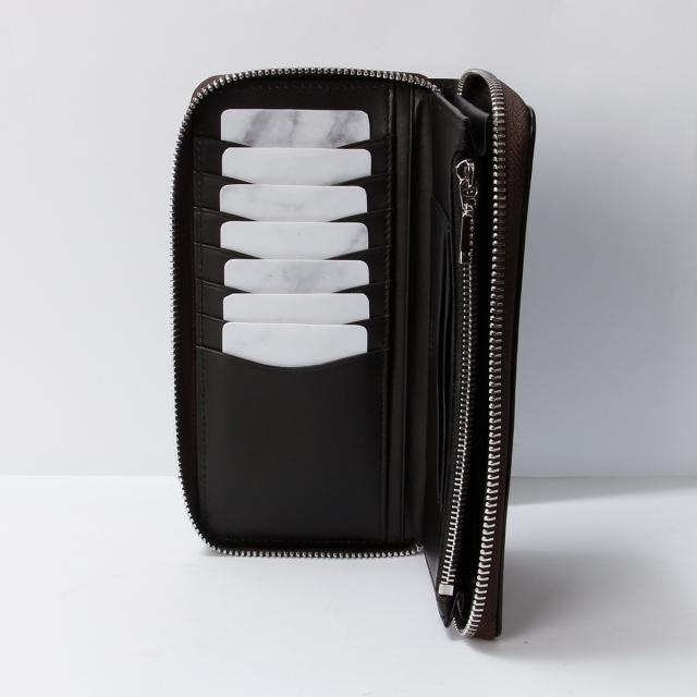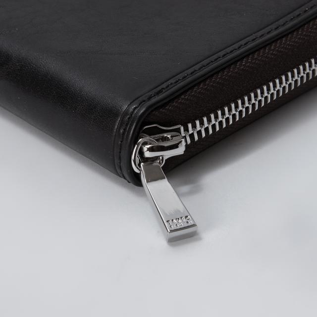 | イタリアンショルダーレザーを使用した、男らしい素材感のタケオキクチのラウンドファスナー型長財布。特殊な染色技術により生まれるナチュラルなムラ感は、オリジナリティあふれる魅力を放ちます。 |