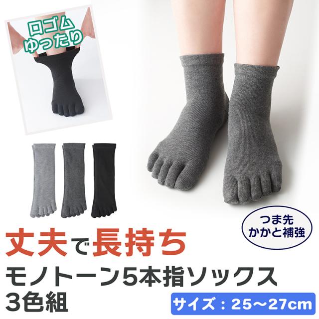 メンズ 2016230 丈夫で長持ち モノトーン 5本指ソックス 3色組 25-27cm つま先補強 かかと補強 摩耗耐久 丈夫 擦り切れにくい 紳士 三笠 MIKASA