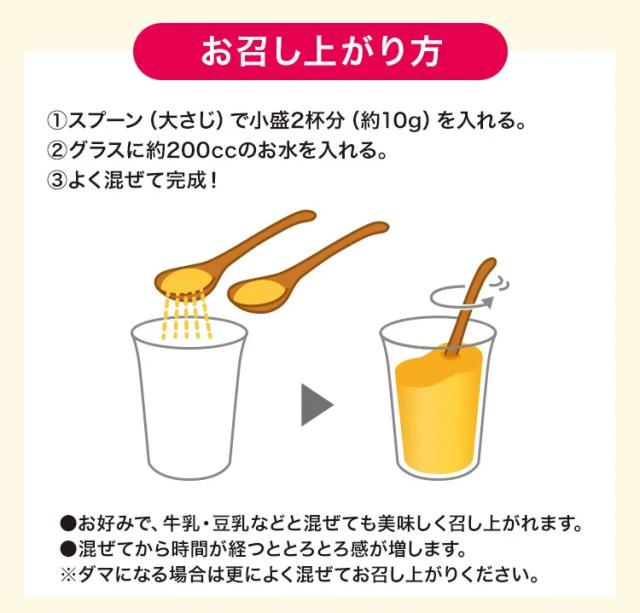 1:スプーン(大さじ)で小盛2杯分(約10g)を入れる。 2:グラスに約200ccの水を入れる。 3:よく混ぜて完成。 ●お好みで、牛乳・豆乳などと混ぜても美味しくお召し上がれます。 ●混ぜてから時間が経つととろとろ感が増します。 ※ダマになる場合は更によく混ぜてお召し上がり下さい。 |