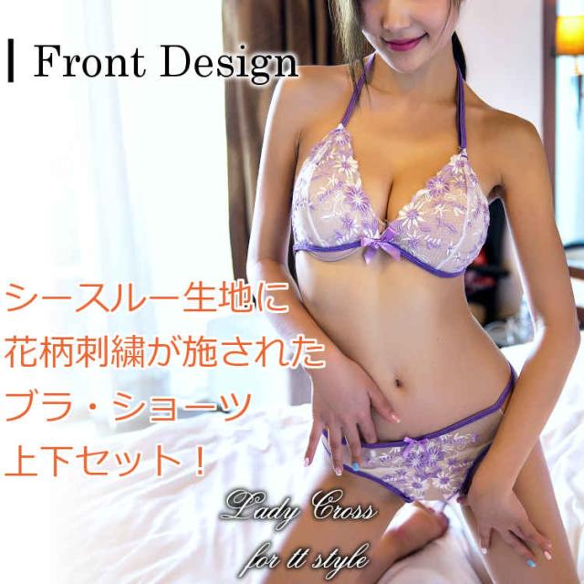 シースルーの花柄レースを基調にしたセクシーブラ&ショーツ2点セット。