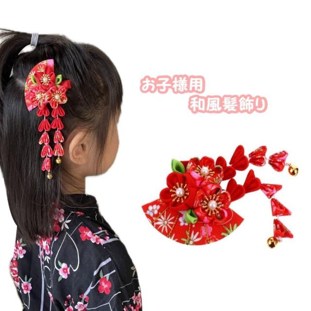 こども 和風 髪飾り 赤 ヘアクリップ キッズ つまみ細工 日本髪 ヘアアクセサリー 扇 浴衣 着物 結婚式 七五三 お正月 ひな祭り お祭り