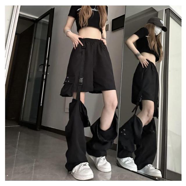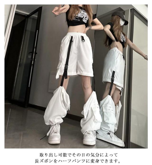 | ロング丈・ハーフ丈の2WAYで楽しめるカーゴパンツ。 取り出し可能でその日の気分によって長ズボンをハーフパンツに変身できます。 普段着はもちろん、ダンスウエアにもおすすめな一本。 | |