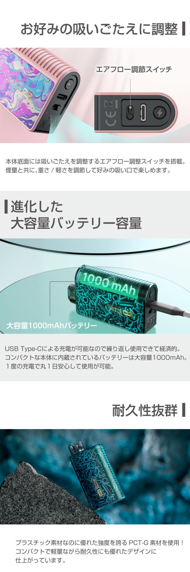 従来モデルであるGOTEK X(ゴーテックX)やGOTEK S(ゴーテックS)のバッテリー容量は650mAhなのに対して、GOTEK Nano(ゴーテックナノ)のバッテリー容量は1000mAhとパワーアップ!!