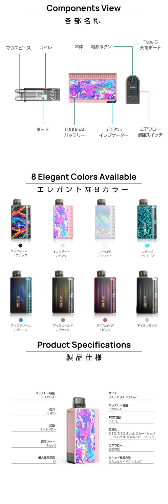 本体はお好みに合わせて使い分けできる2Way仕様のPOD型VAPE(ベイプ)となっており、付属の空カートリッジにお好みのリキッドを注入して圧倒的コスパの「電子タバコタイプ」としての使用はもちろんのこと、別売りのリキッド充填済みのカートリッジ※でかんたんお手軽「持ち運びシーシャタイプ」としても使用できる次世代型の画期的な電子タバコとなっております。 また、お好みのリキッドを注入できる空カートリッジは5回?10回繰り返し使用することが可能で圧倒的なコストパフォーマンスを実現!